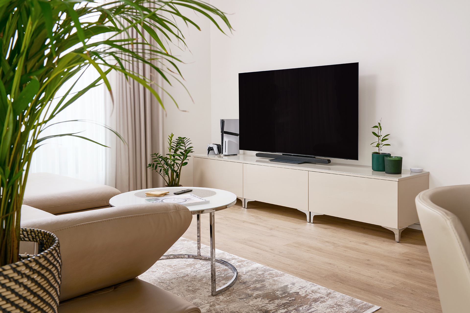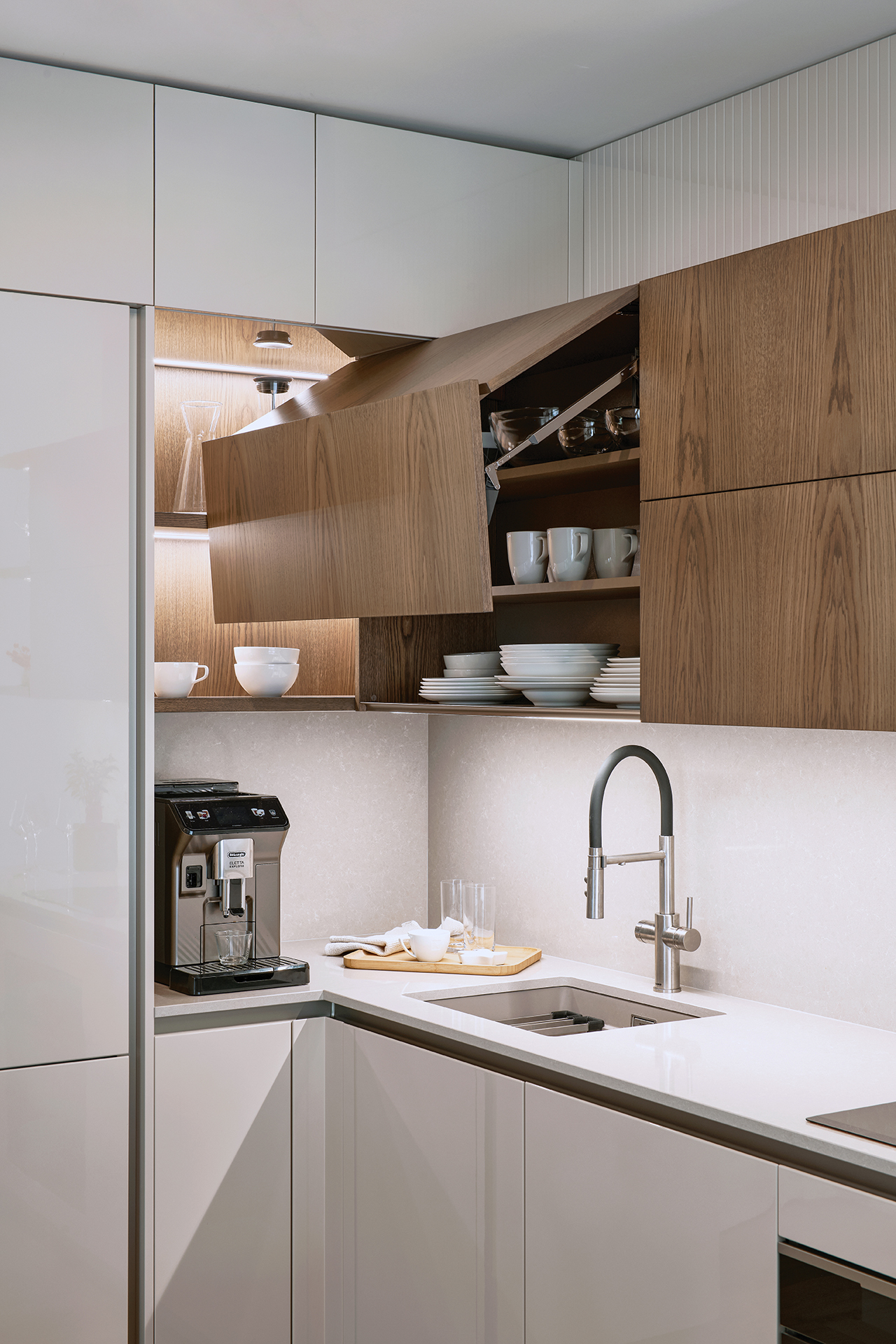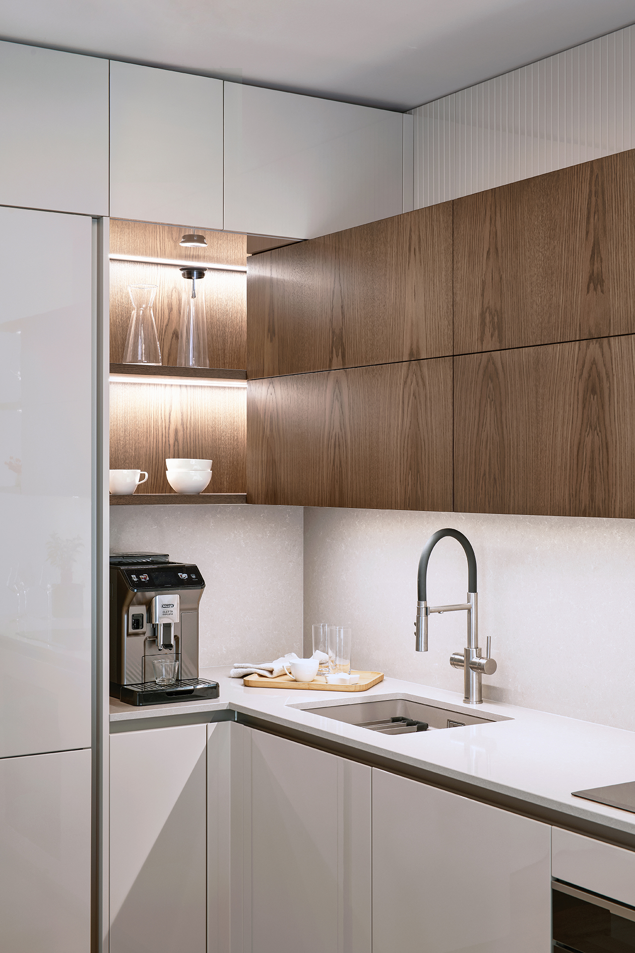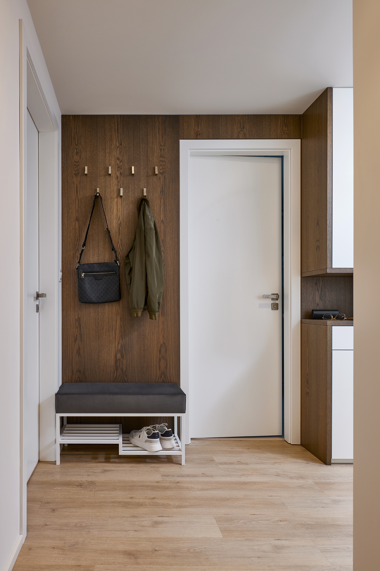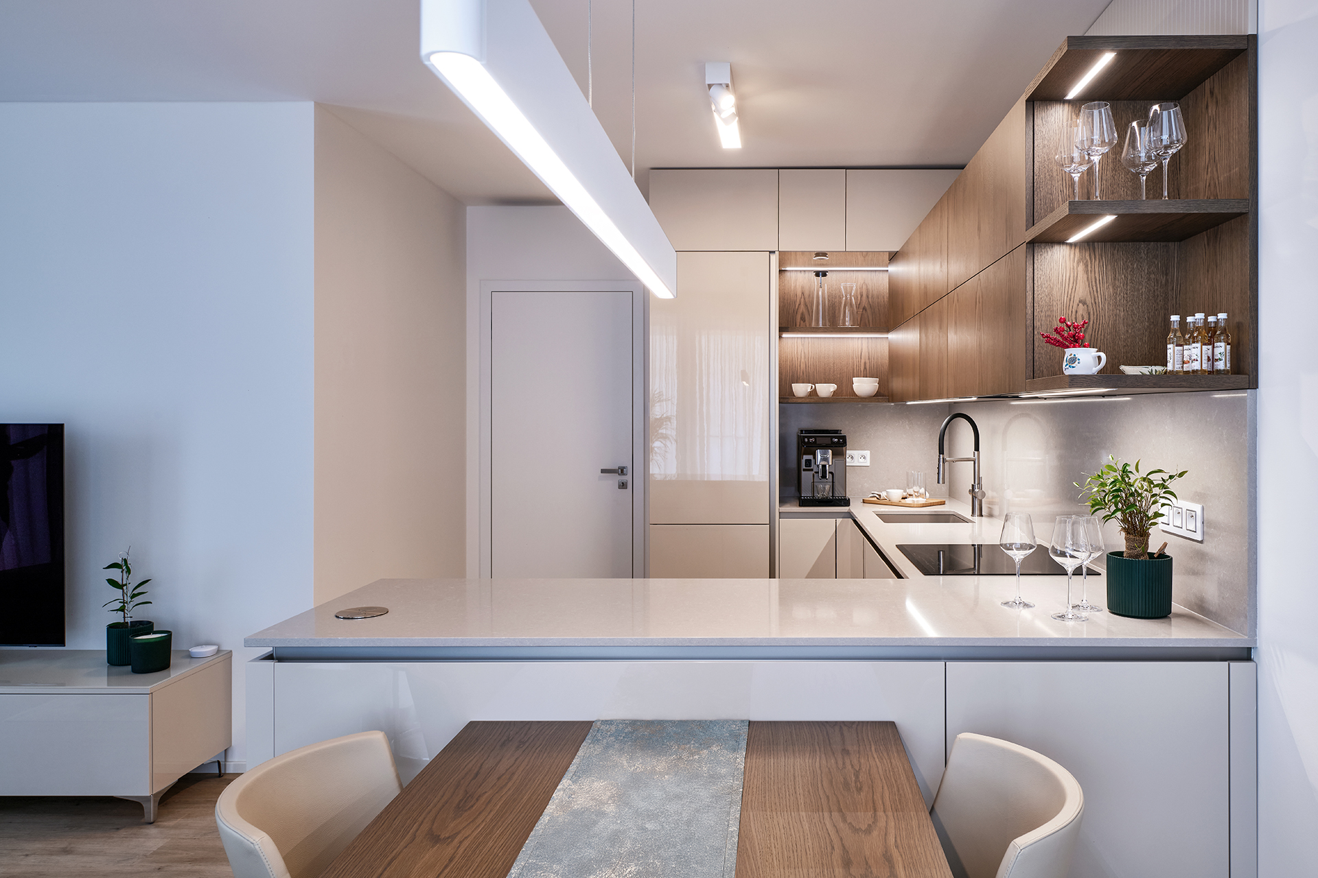 Interiér tohoto bytu stojí na jasně definovaném materiálovém konceptu a vyváženém vizuálním projevu. Celým prostorem prostupuje kombinace vysokého lesku v odstínu champagne a šedé dýhy amerického dubu. Tato souhra vytváří klidnou, noblesní atmosféru a zároveň obstojí v nárocích na dlouhodobou kvalitu.
