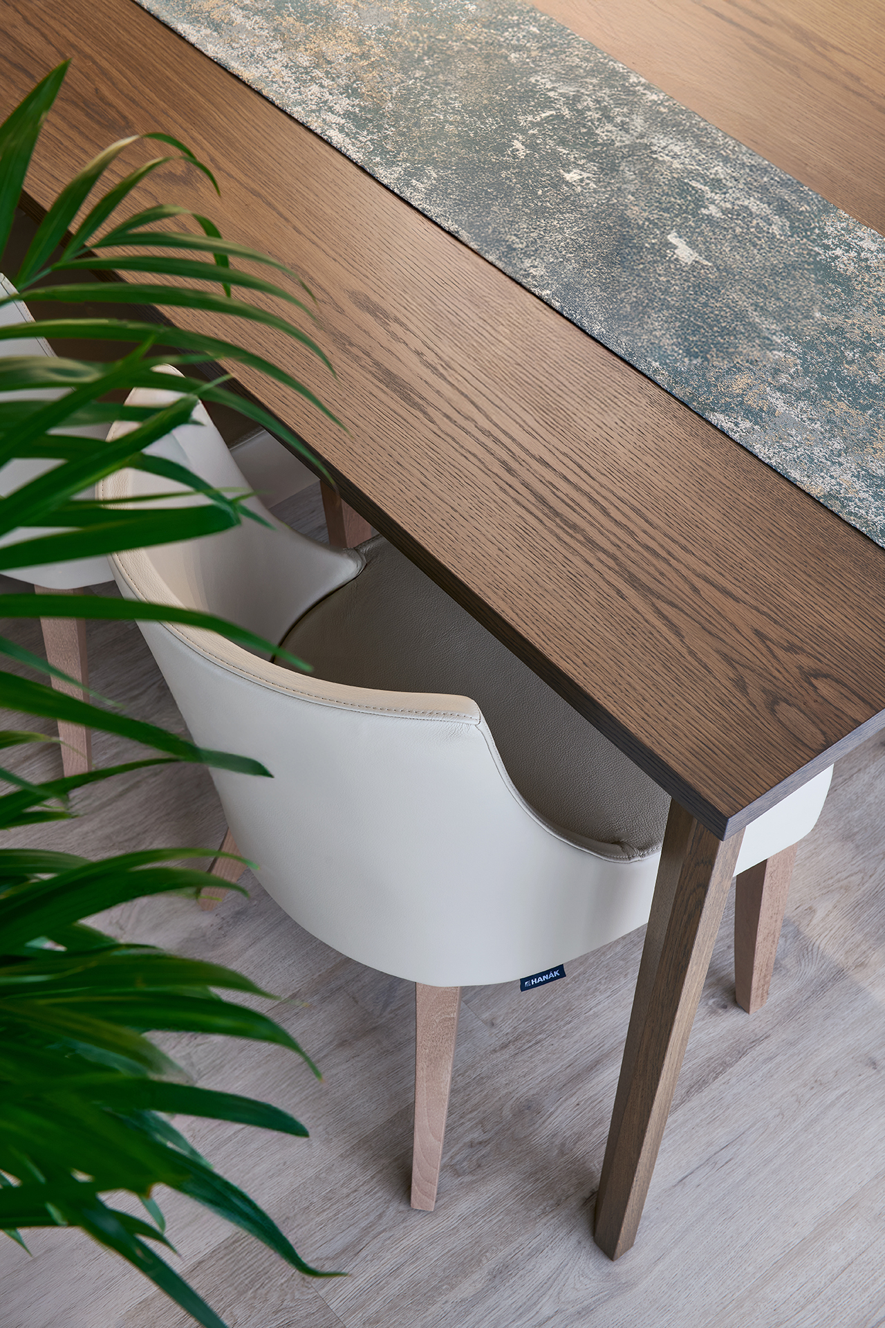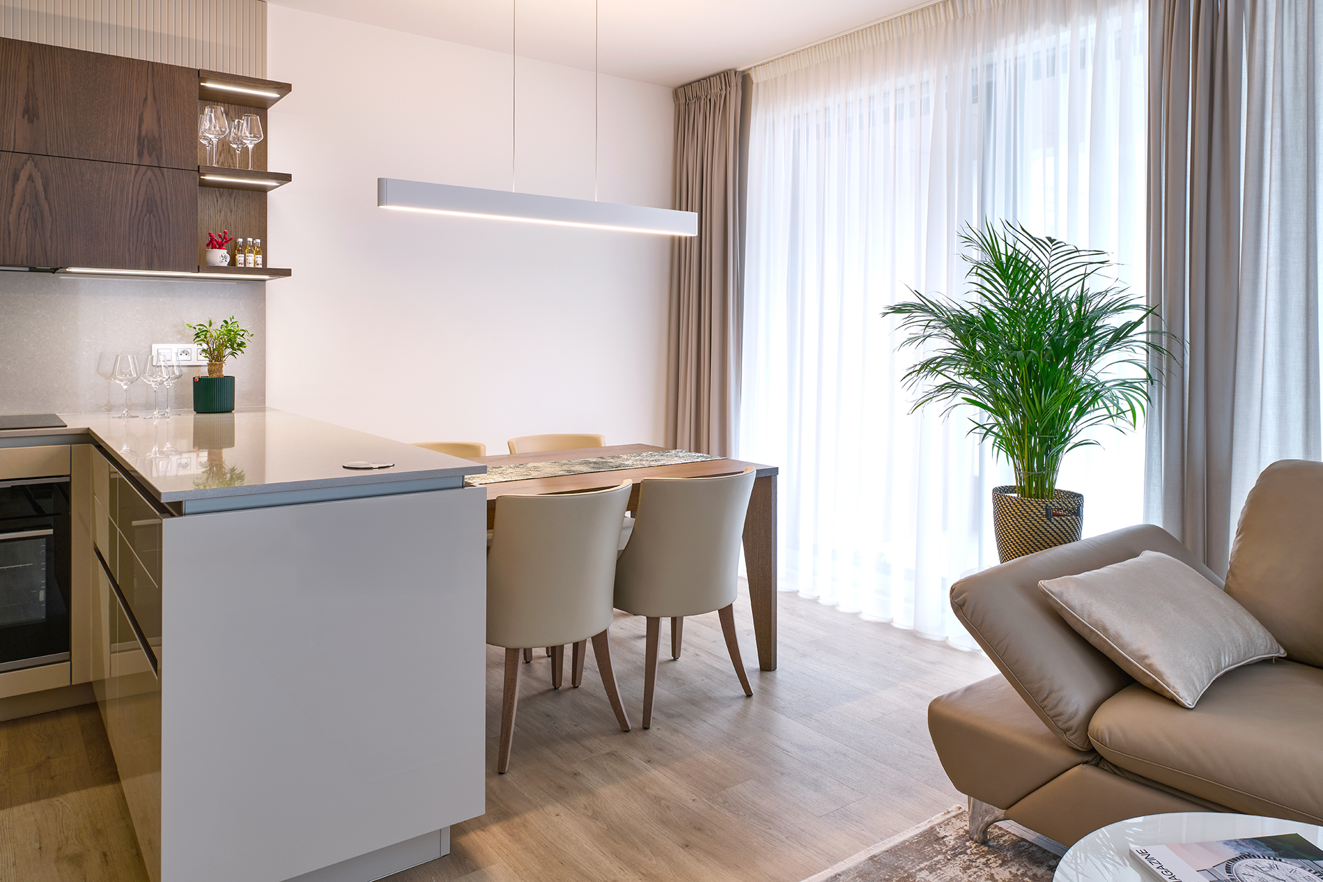 Kuchyně ELEGANTE/LINE se stává centrem celé realizace a definuje její osobitý rukopis. Čisté, minimalistické plochy zde kontrastují s výraznou kresbou dřeva a propůjčují celku nadčasový ráz. Tento vizuální dialog podtrhuje horní linie skříněk s integrovaným LED podsvícením – to nejen precizně osvětluje pracovní plochu, ale v kombinaci s otevřenými nikami dává vyniknout hloubce dýhy a vytváří působivý detail. Na kuchyni plynule navazuje jídelní kout s masivním stolem JS32 a koženými židlemi KELLY, které doplňují společenskou zónu. Obývací prostor uzavírá TV stěna LINE, jejíž jednoduché řešení podporuje moderní a vyvážený charakter domova.