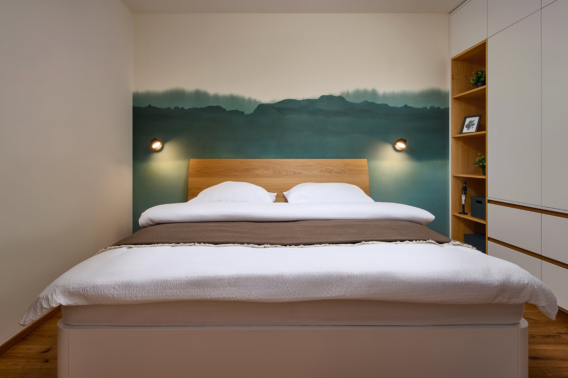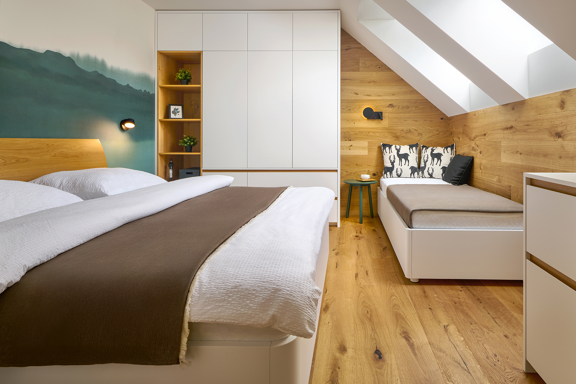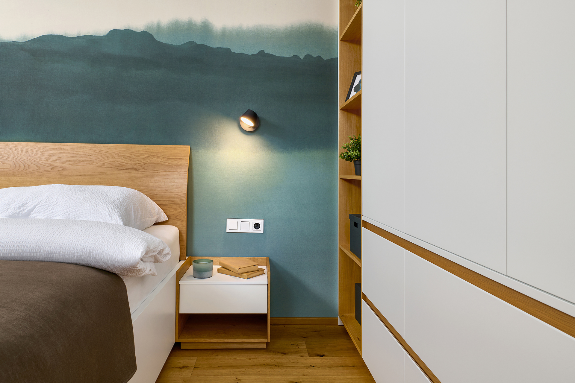 Diskrétní útočiště pro odpočinek nabízí ložnice s postelemi KLAUDIE s masivním čelem a LARA s elegantně zaoblenými liniemi, které místnosti dodávají pocit bezpečí a soukromí. Vestavěná šatní sestava s tip-on otevíráním a úchytkami Solid poskytuje praktické úložné řešení, aniž by narušovala čistý a klidný charakter interiéru.