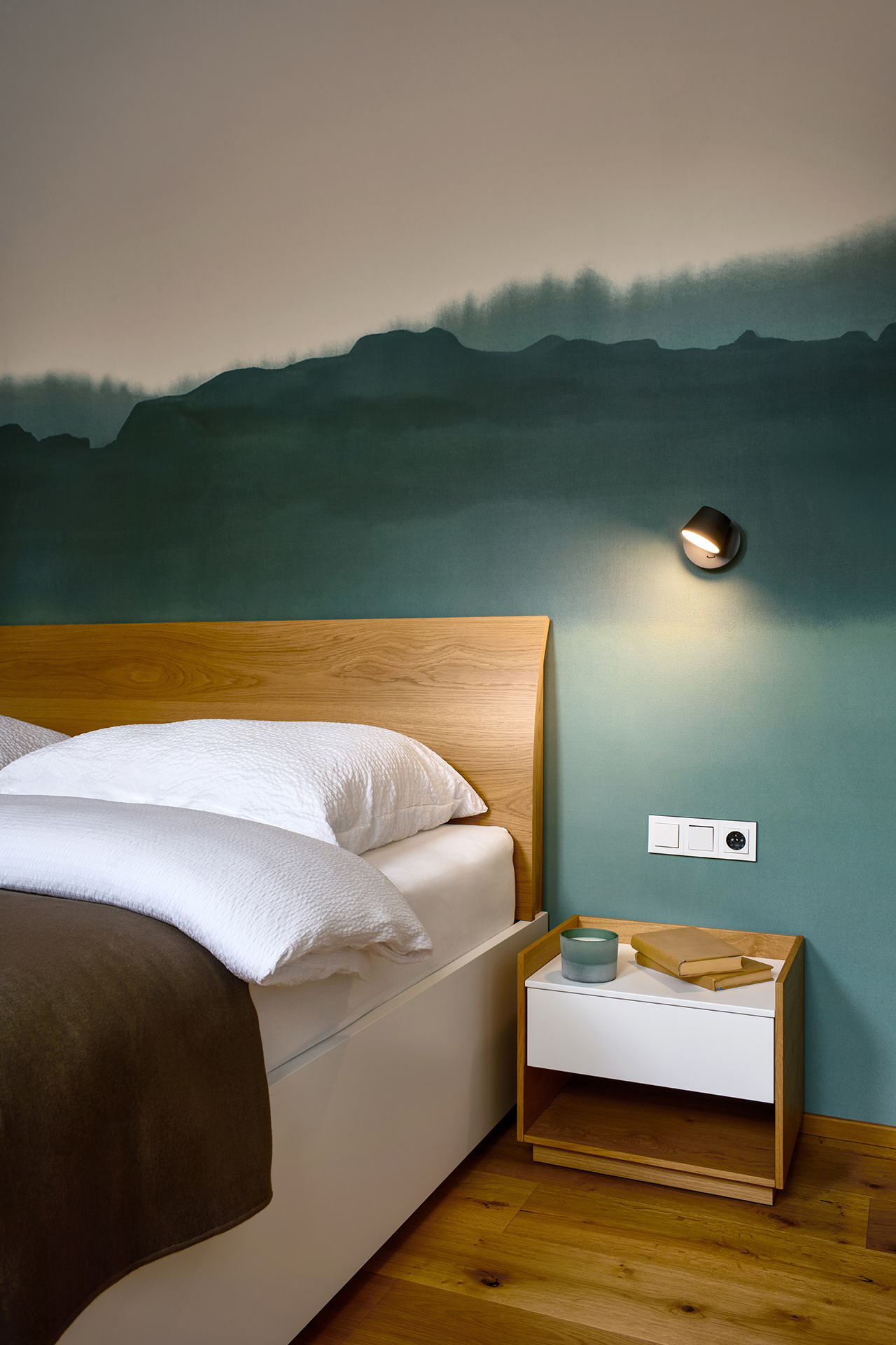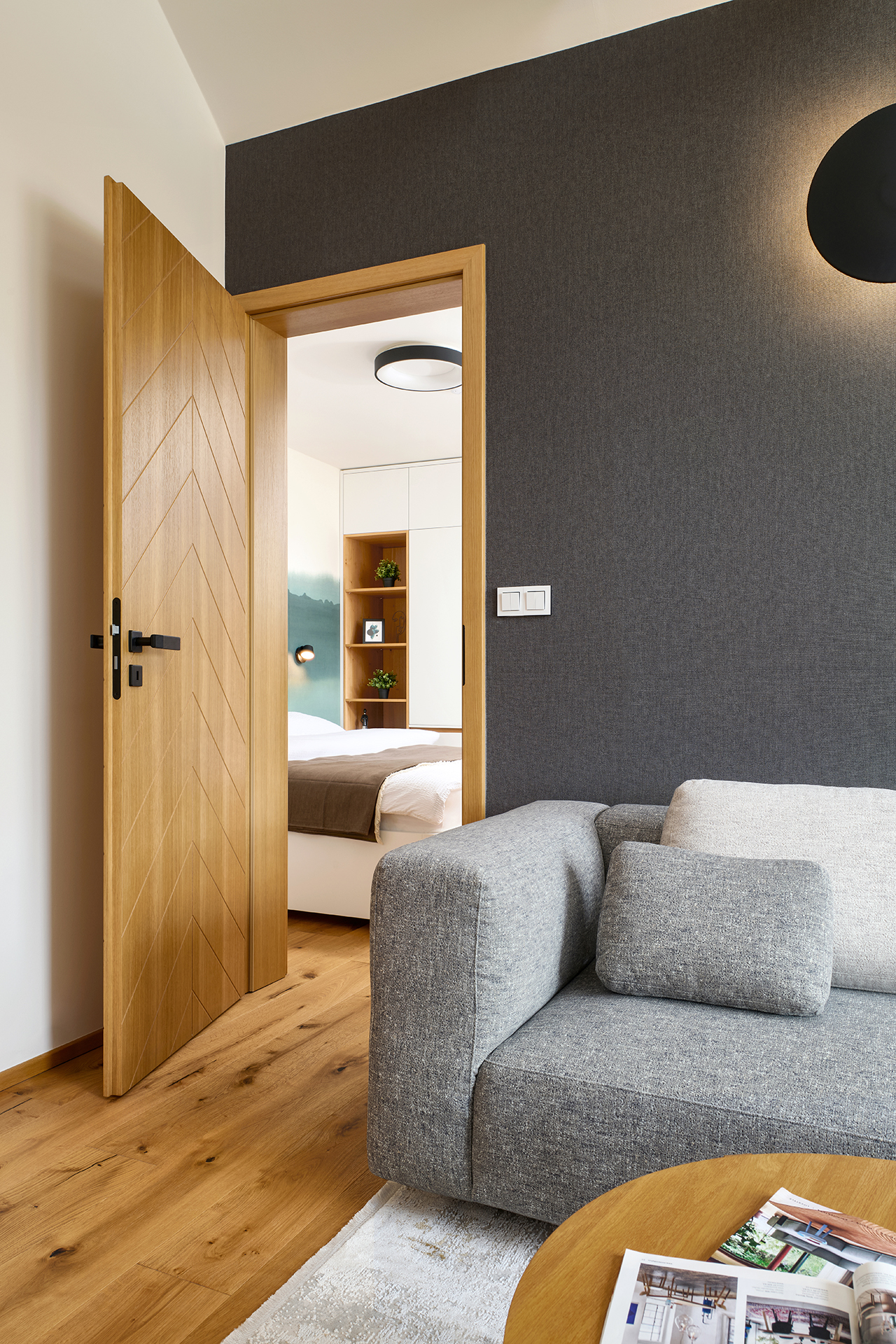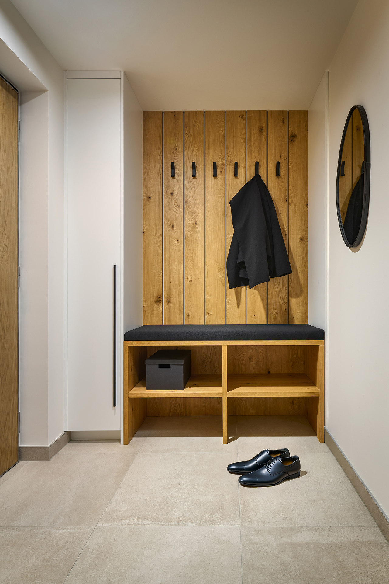 Diskrétní útočiště pro odpočinek nabízí ložnice s postelemi KLAUDIE s masivním čelem a LARA s elegantně zaoblenými liniemi, které místnosti dodávají pocit bezpečí a soukromí. Vestavěná šatní sestava s tip-on otevíráním a úchytkami Solid poskytuje praktické úložné řešení, aniž by narušovala čistý a klidný charakter interiéru.