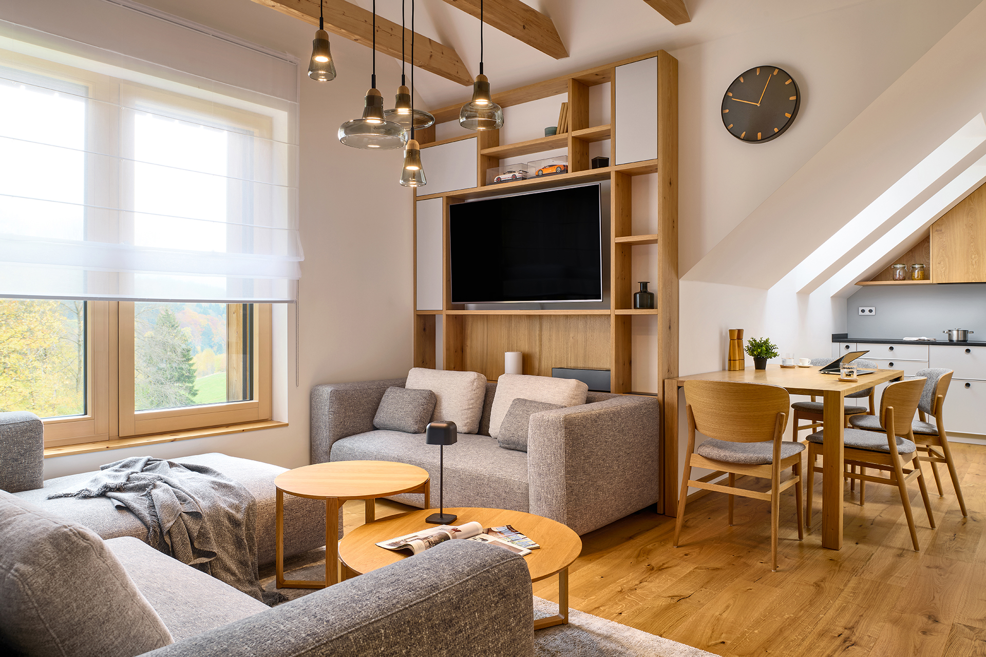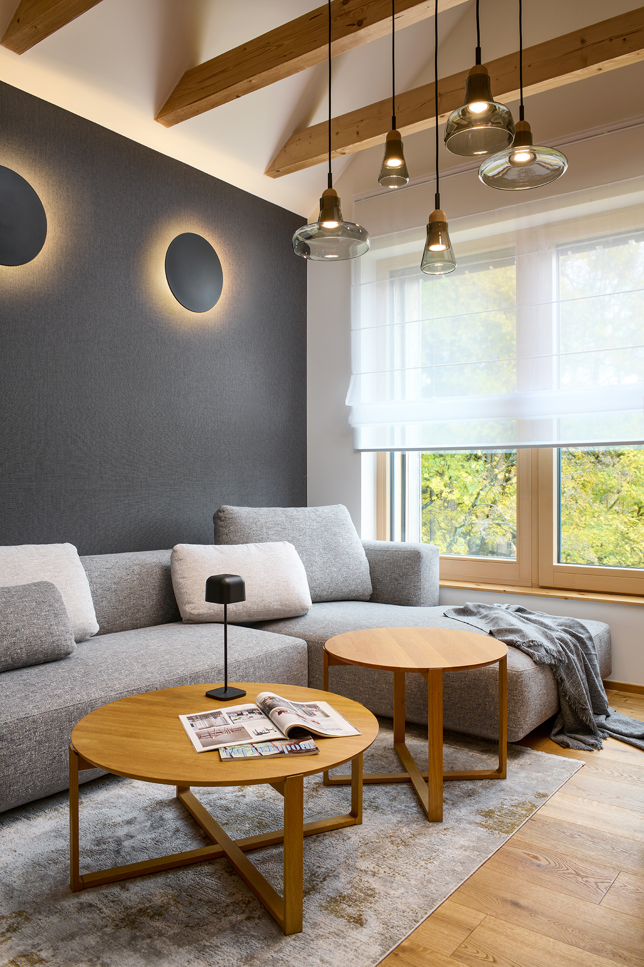 Z kuchyně se plynule vstupuje do obývací části, kde sestava HARMONY spojuje jemné tóny s přirozenou kresbou trámů a podtrhuje celkovou atmosféru prostoru. Pohodlná sedací souprava POLYGON je stvořená pro rodinná setkání i tichou, ničím nerušenou pohodu.