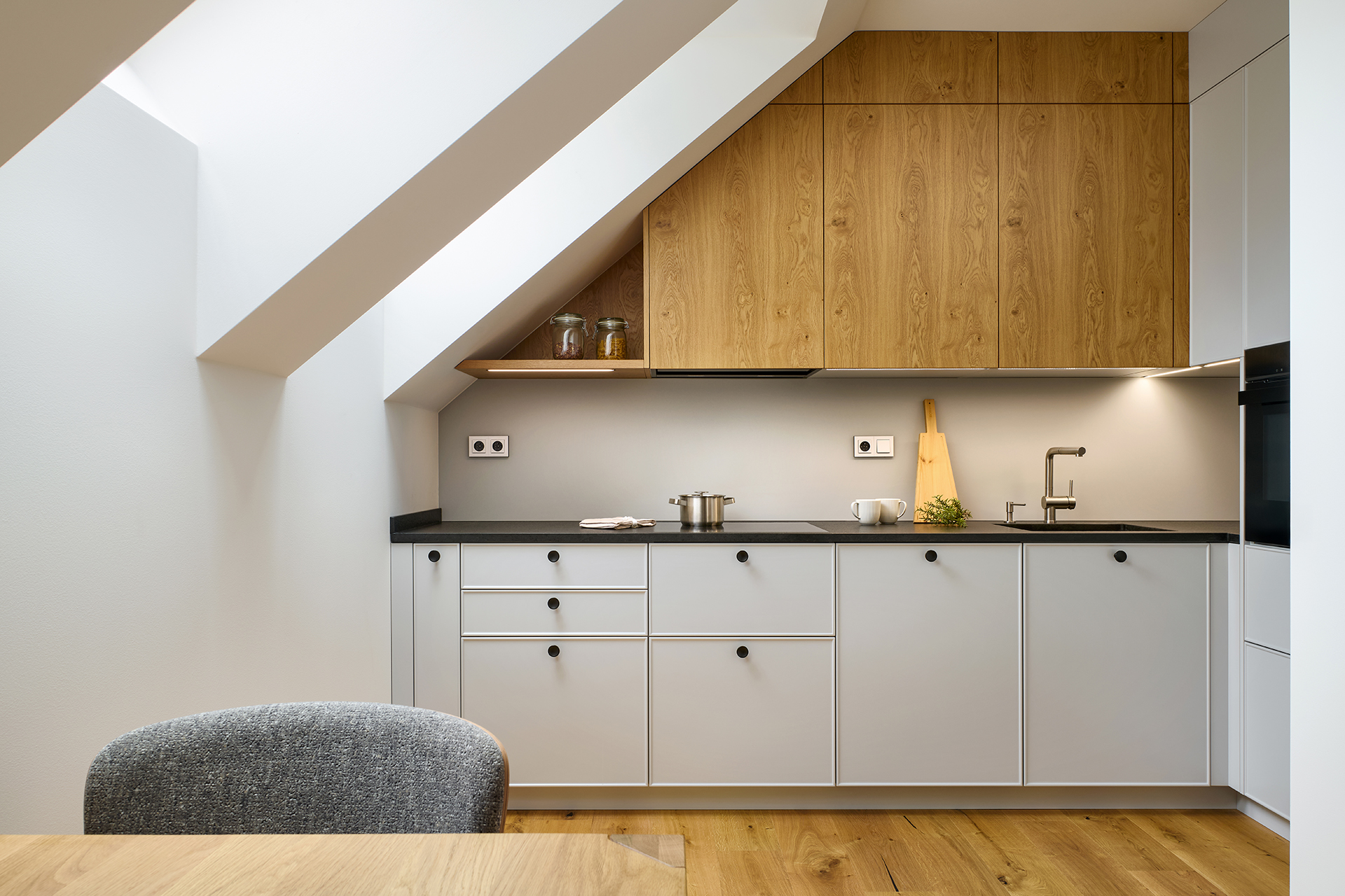 Dominantou prostoru je kuchyně CUBIC v odstínu light grey, kde designéři využili atypické podkrovní zkosení do posledního centimetru. Jemné linie nechávají vyniknout rustikální dub na horních skříňkách, jehož textura dodává místu útulný charakter. Kontrastní černá žulová deska Nero Assoluto přináší eleganci a odolnost, zatímco spotřebiče Siemens zajišťují spolehlivý provoz.