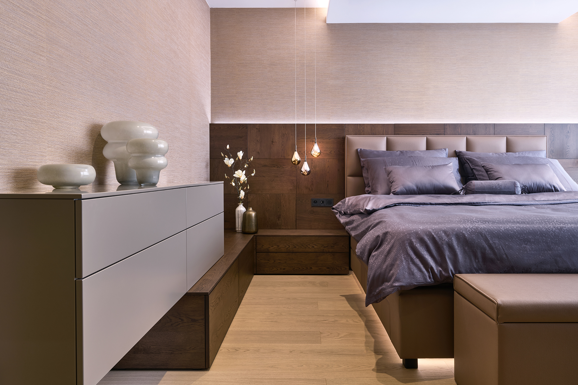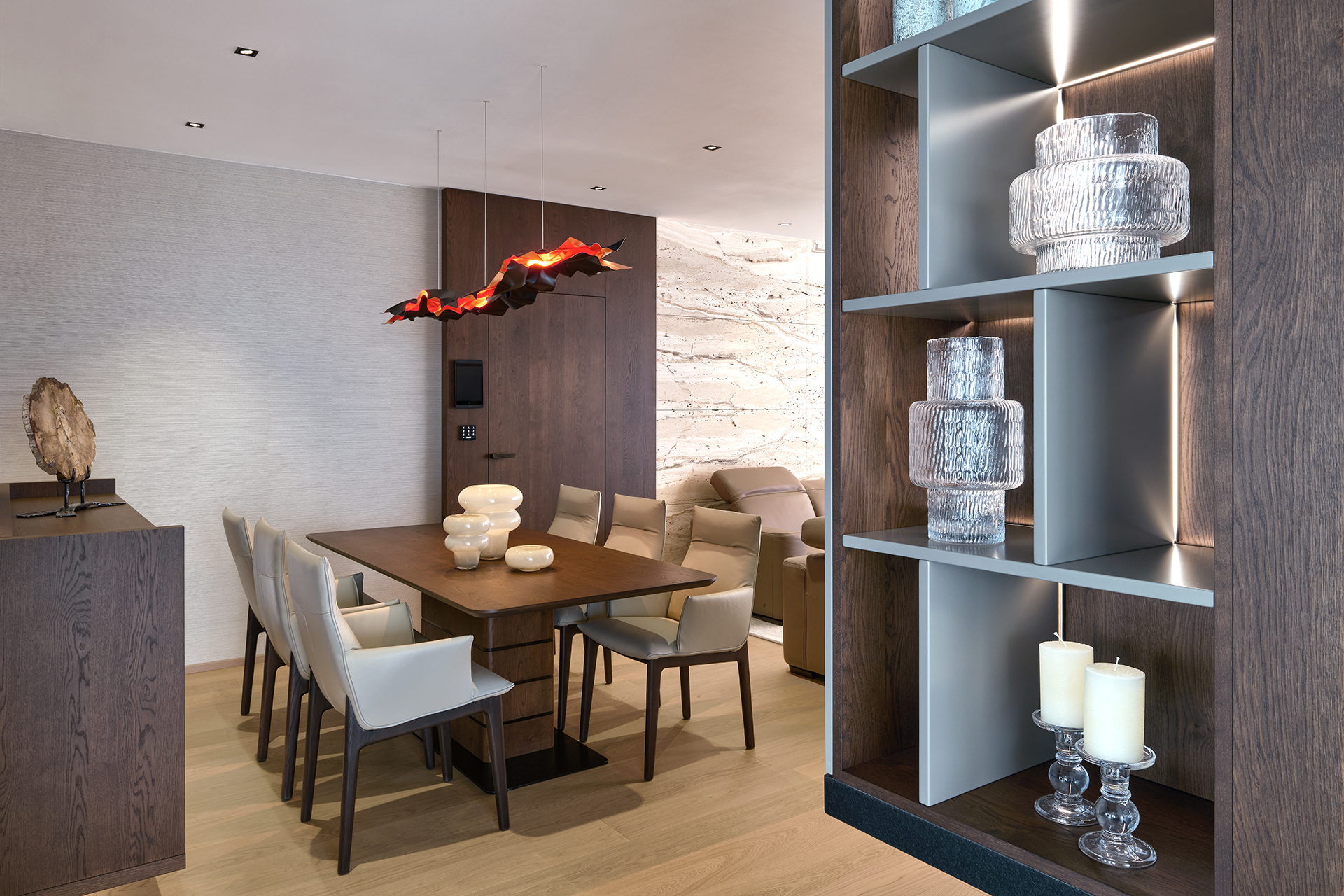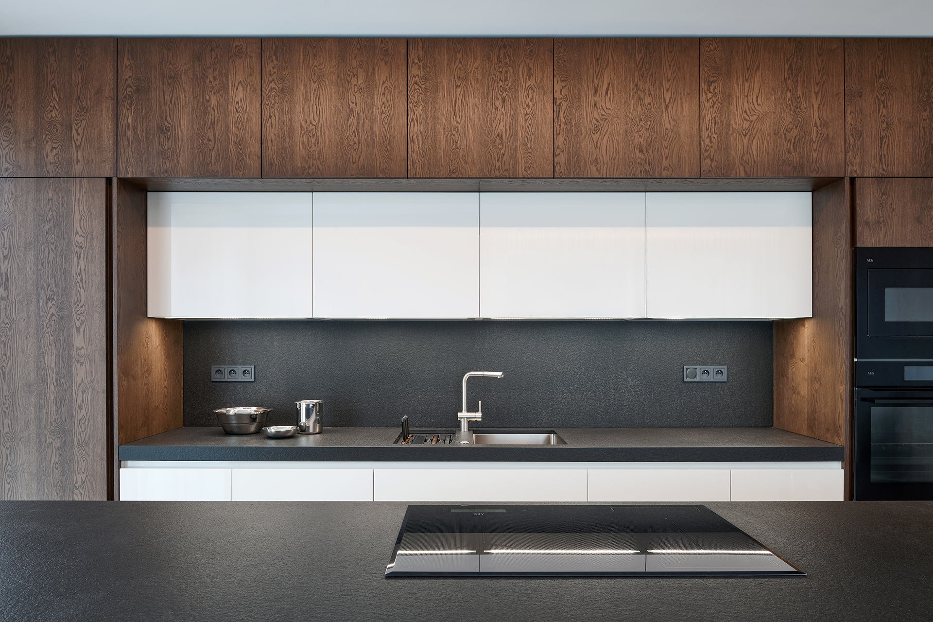 Tato realizace představuje spojení moderní architektury a precizního řemesla. Každý detail je navržen tak, aby podporoval celkovou harmonii prostoru, kde ušlechtilé materiály a čisté linie vytvářejí nekompromisní standard bydlení.