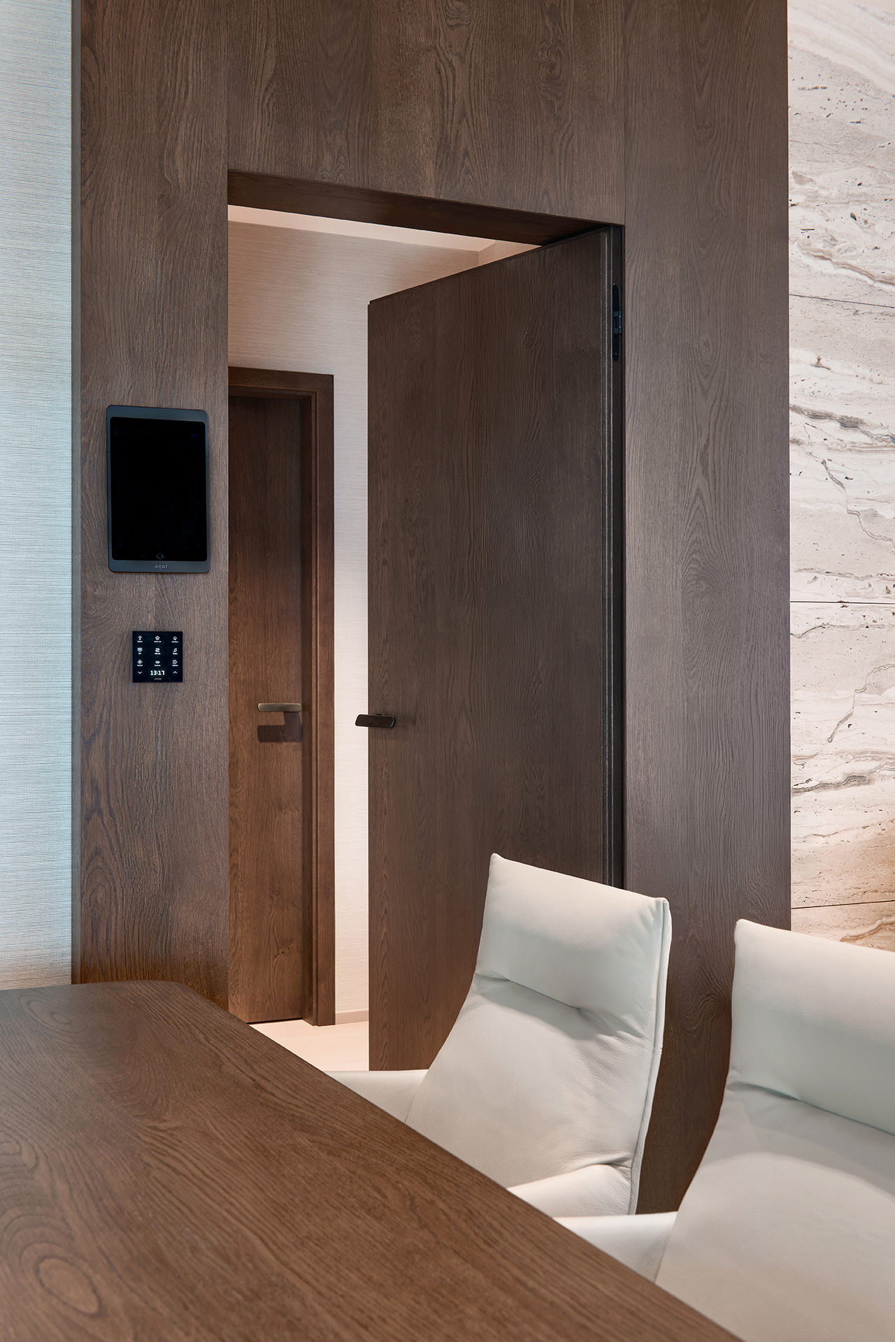 Na zvolený koncept plynule navazuje obývací část. Rustikální dubová dýha se zde rozvíjí v podobě dominantního stěnového obkladu a TV skříňky, čímž vzniká kompaktní celek, který svou strukturou vyvažuje čisté proporce interiéru. Architektonickou čistotu prostoru podtrhují dveře SPACE – někde efektně integrované přímo do obkladu, jinde jako samostatné vstupy, vždy však s dokonalou návazností na okolní linie.