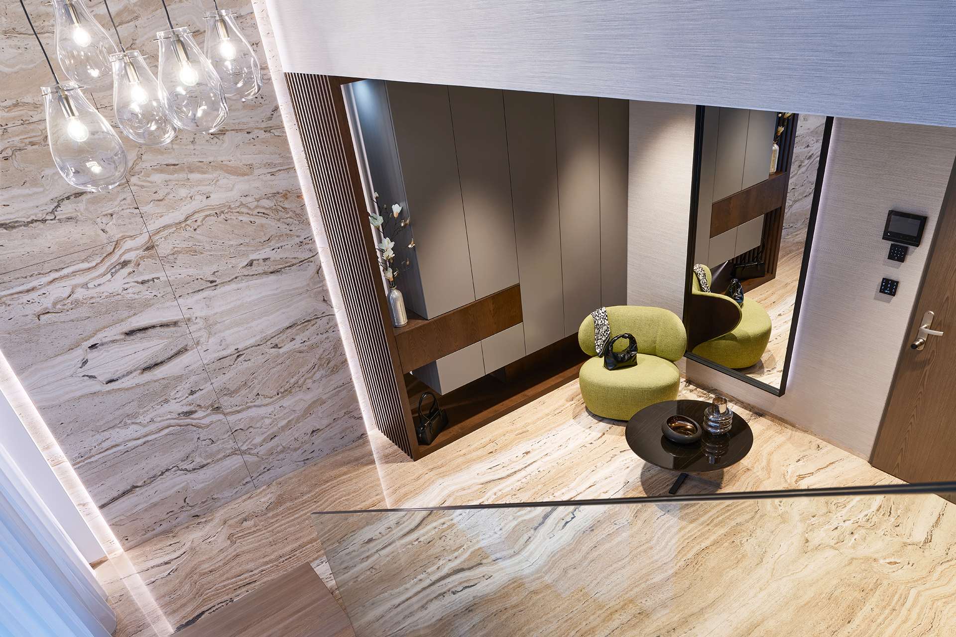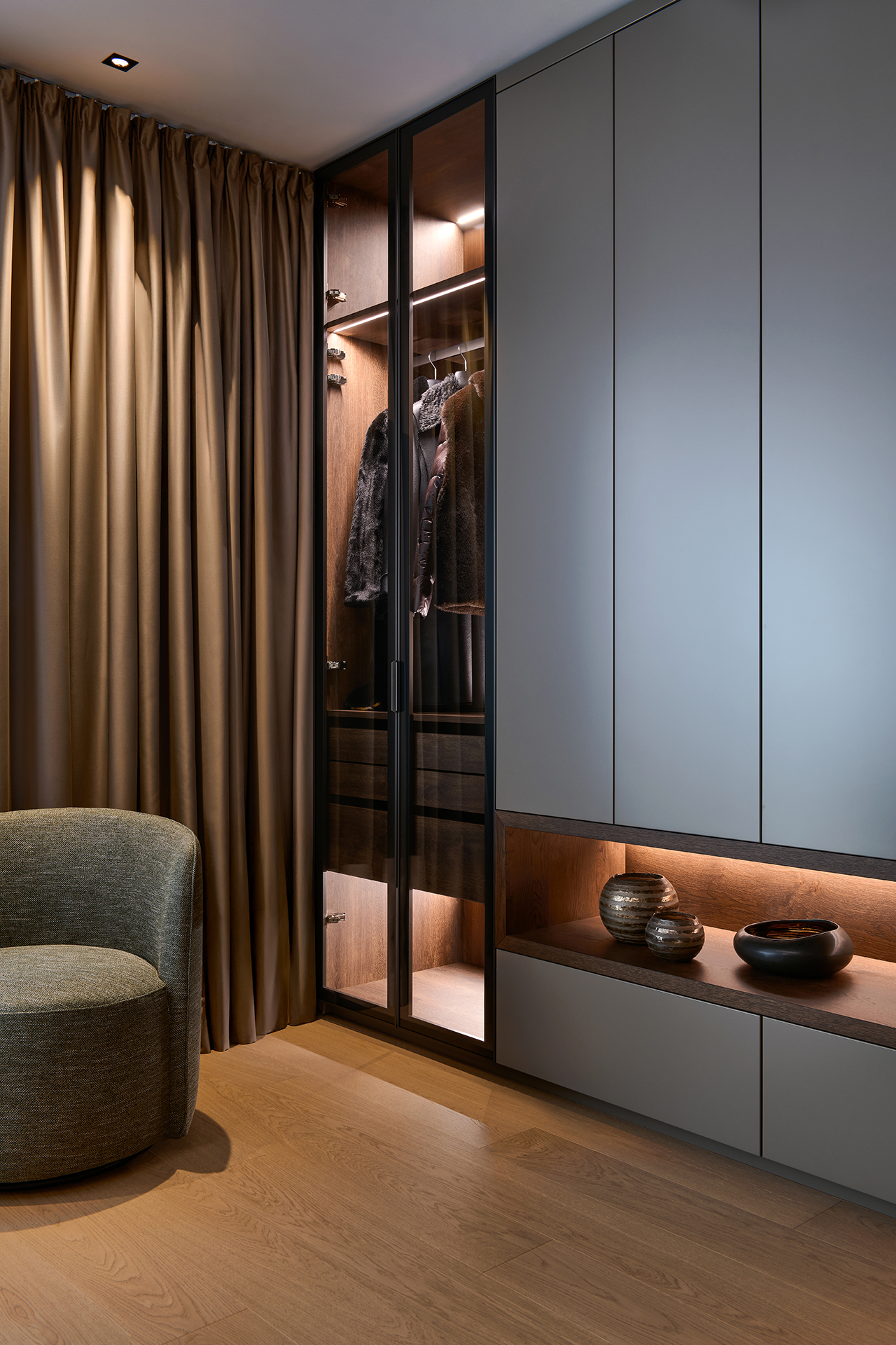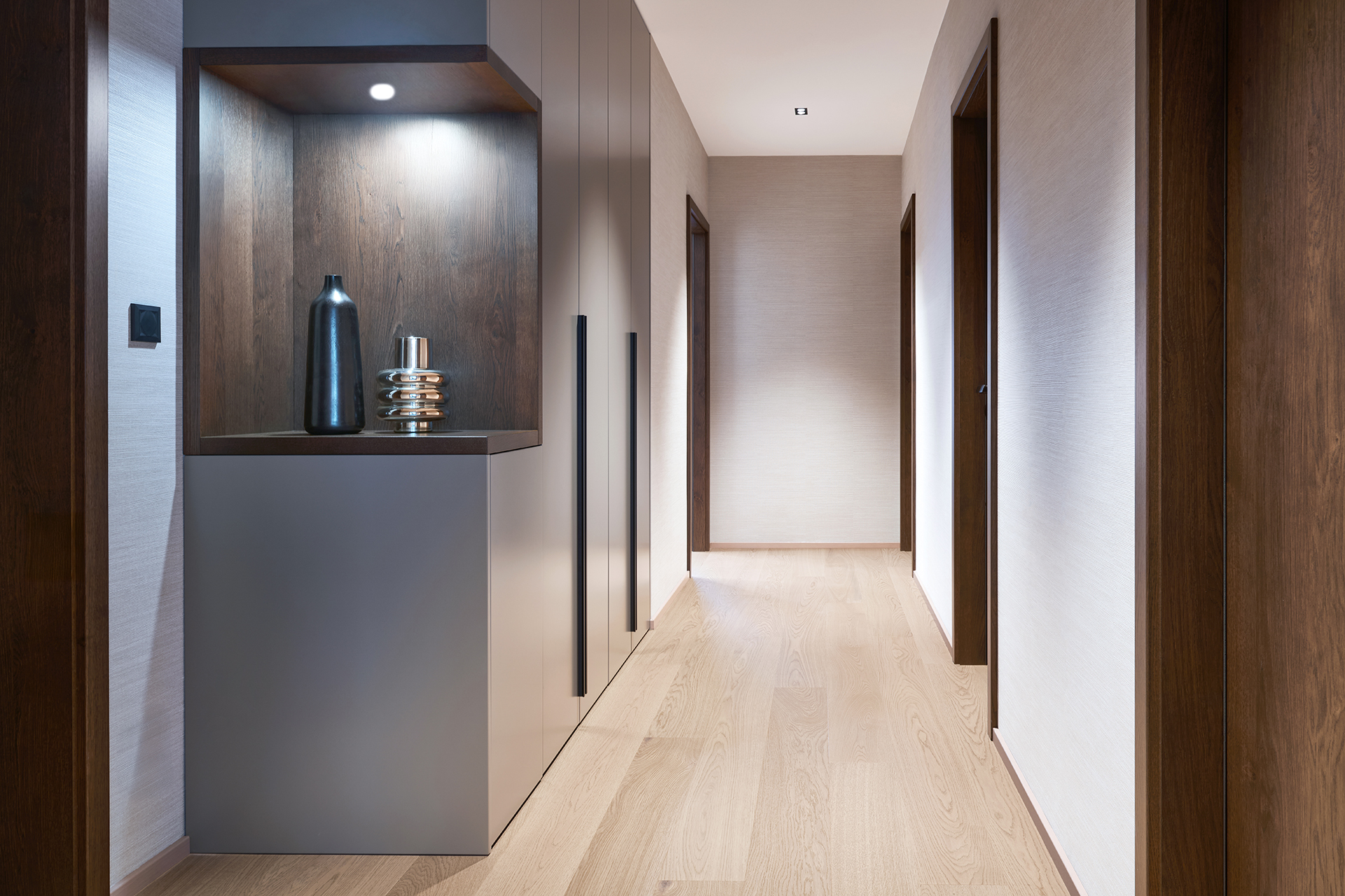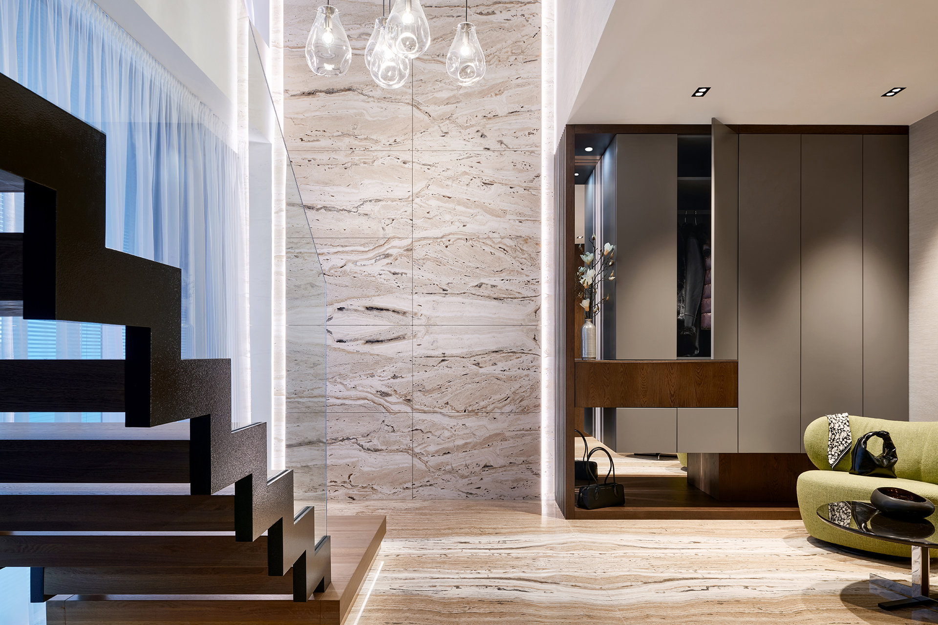 Vstupní chodba nastavuje tón celého interiéru. Dominuje jí monumentální kamenný obklad, jehož přirozená kresba kontrastuje s minimalistickými liniemi vestavných skříní LINE/MIAMI. Jejich jemně zaoblené hrany celek vizuálně změkčují a hned při příchodu navozují pocit komfortu, řádu a vysoké kvality provedení.