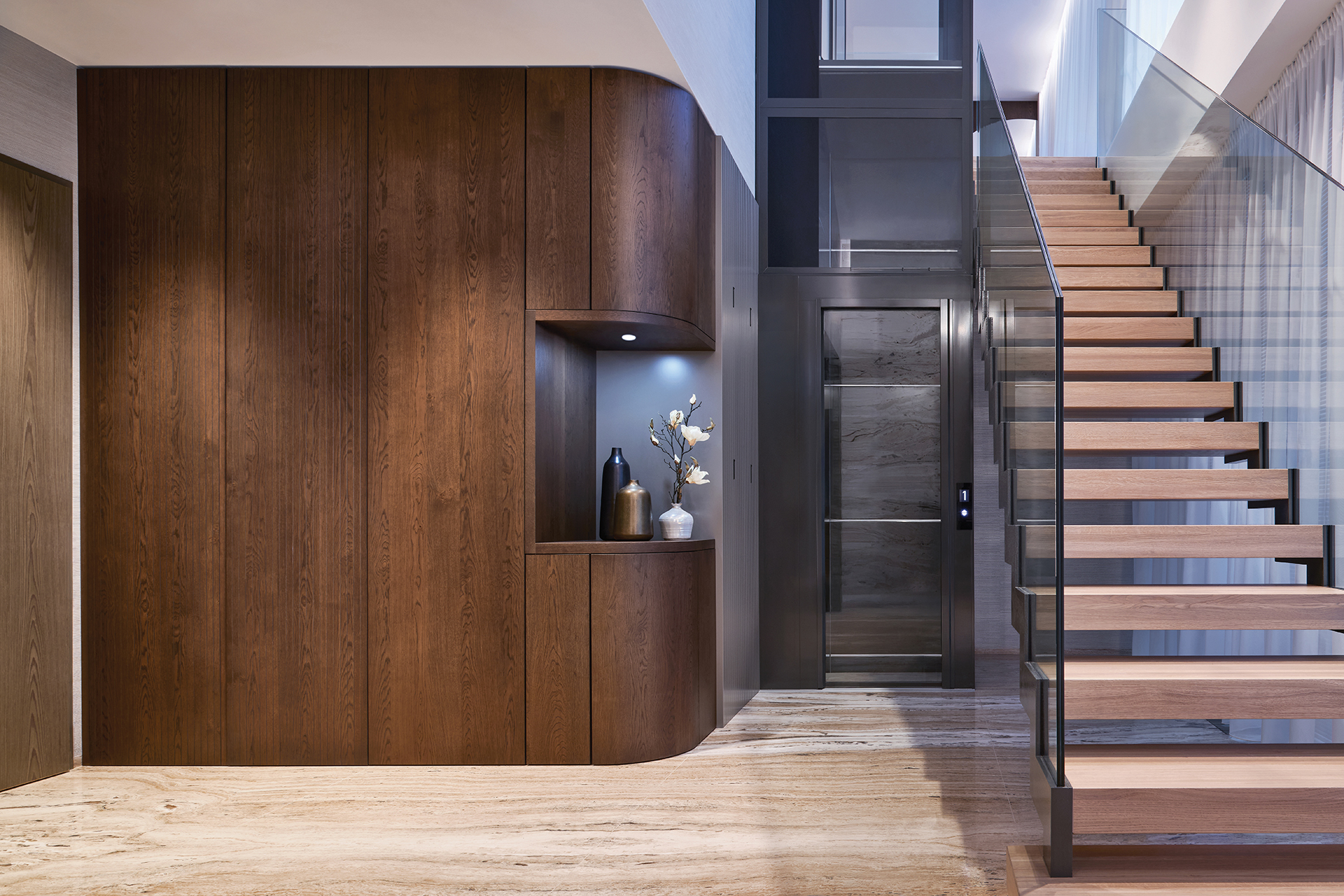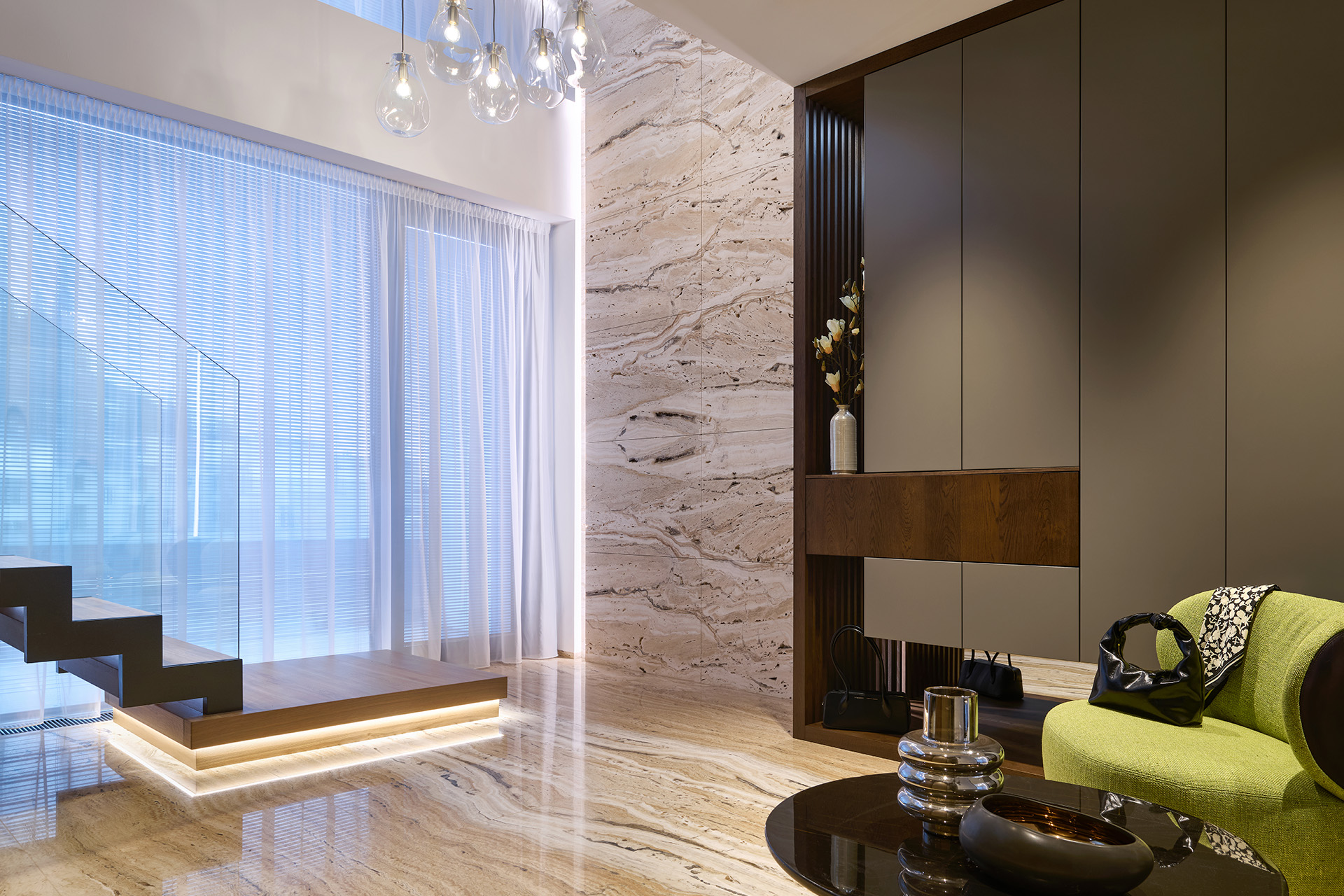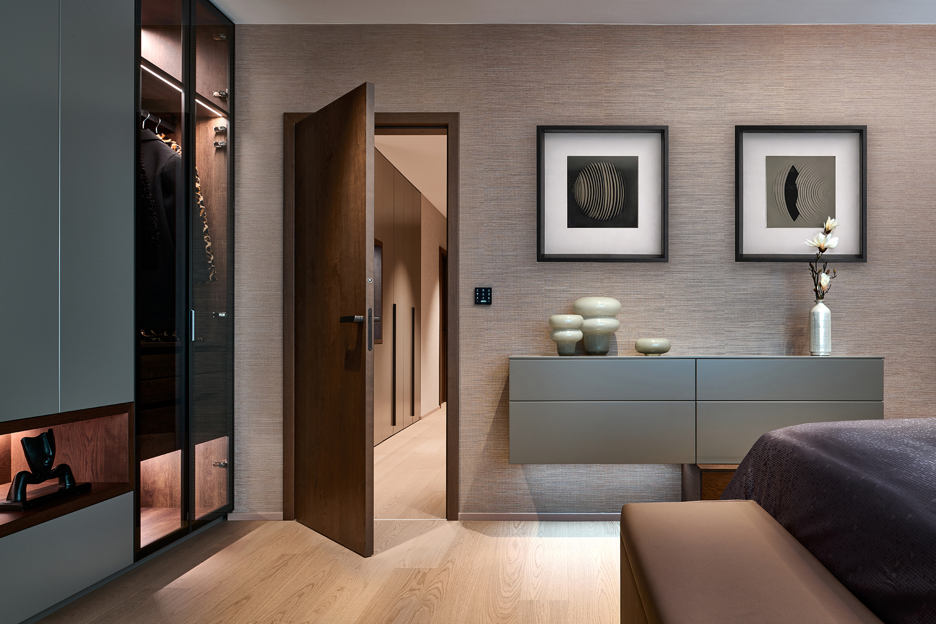 Vstupní chodba nastavuje tón celého interiéru. Dominuje jí monumentální kamenný obklad, jehož přirozená kresba kontrastuje s minimalistickými liniemi vestavných skříní LINE/MIAMI. Jejich jemně zaoblené hrany celek vizuálně změkčují a hned při příchodu navozují pocit komfortu, řádu a vysoké kvality provedení.