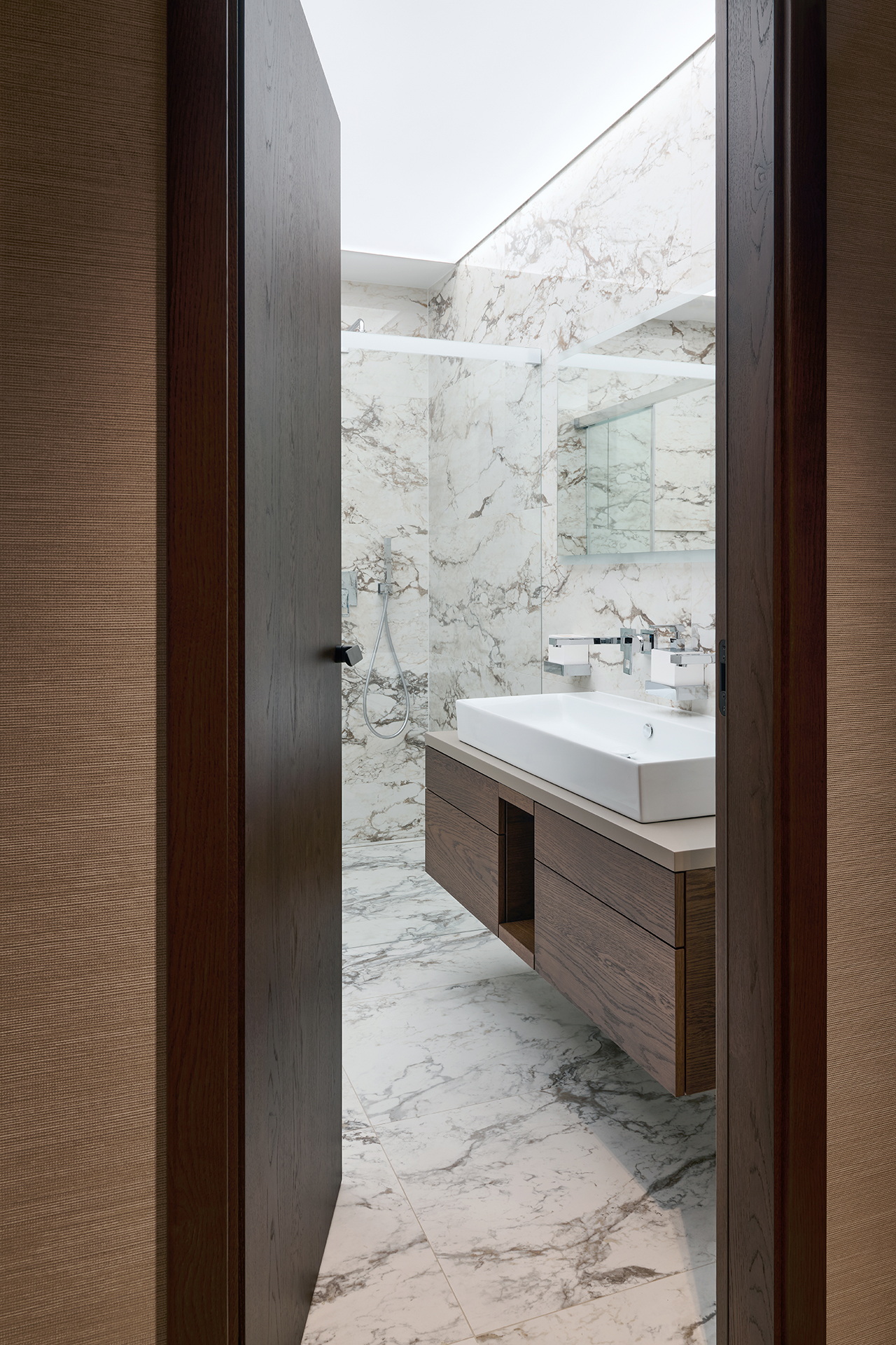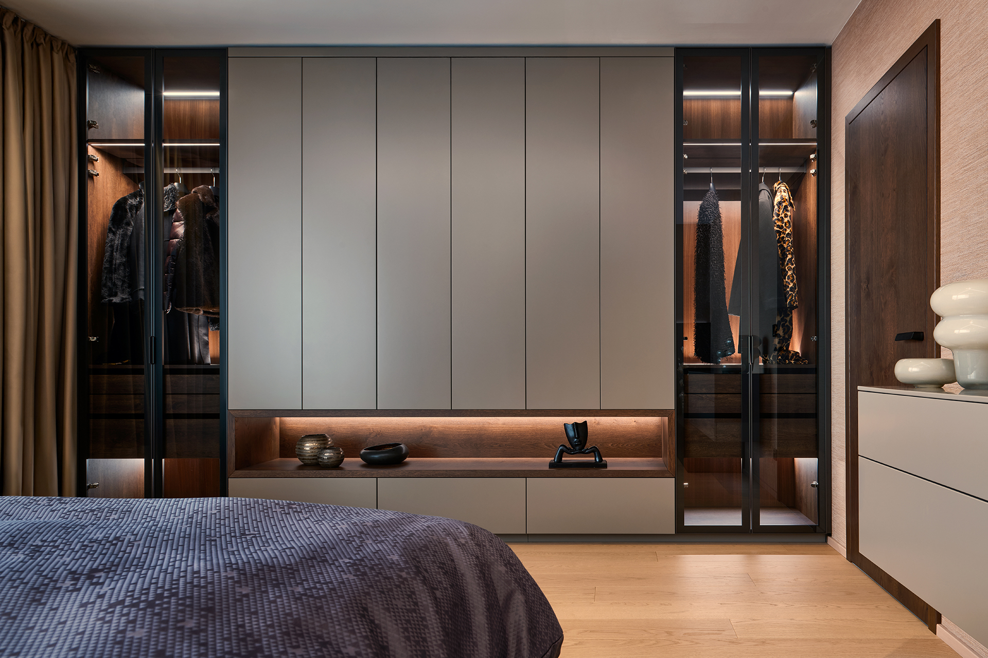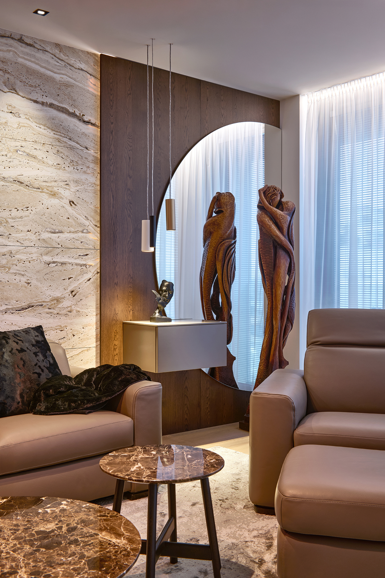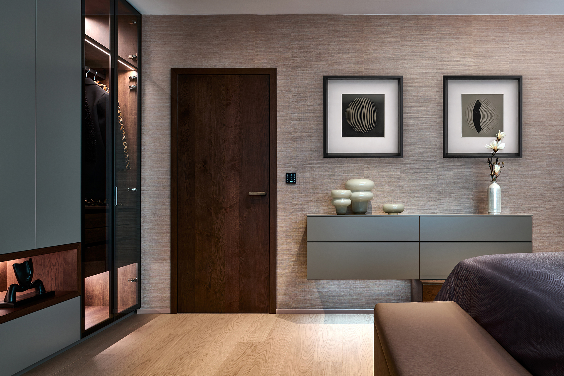 Vstupní chodba nastavuje tón celého interiéru. Dominuje jí monumentální kamenný obklad, jehož přirozená kresba kontrastuje s minimalistickými liniemi vestavných skříní LINE/MIAMI. Jejich jemně zaoblené hrany celek vizuálně změkčují a hned při příchodu navozují pocit komfortu, řádu a vysoké kvality provedení.