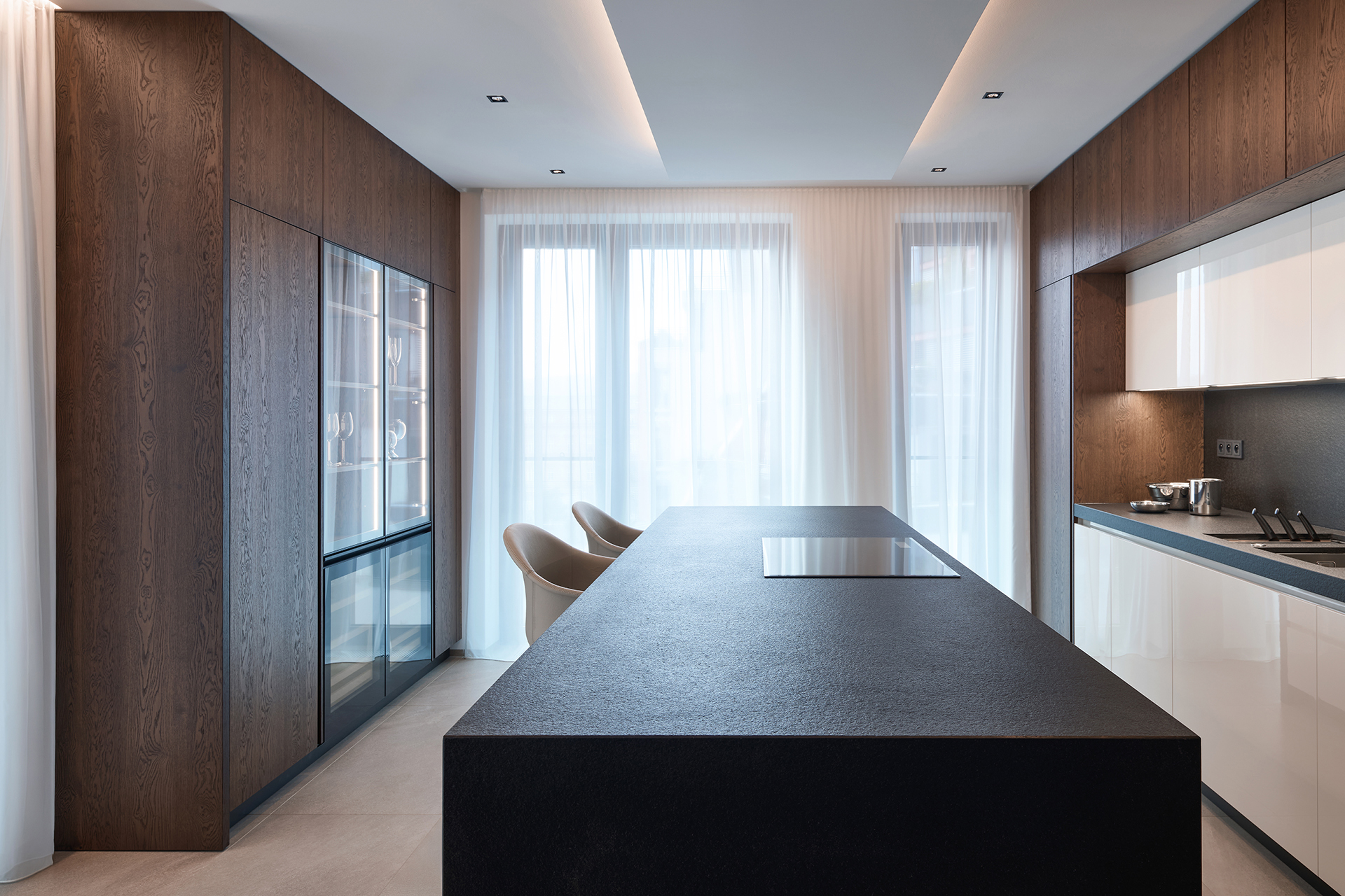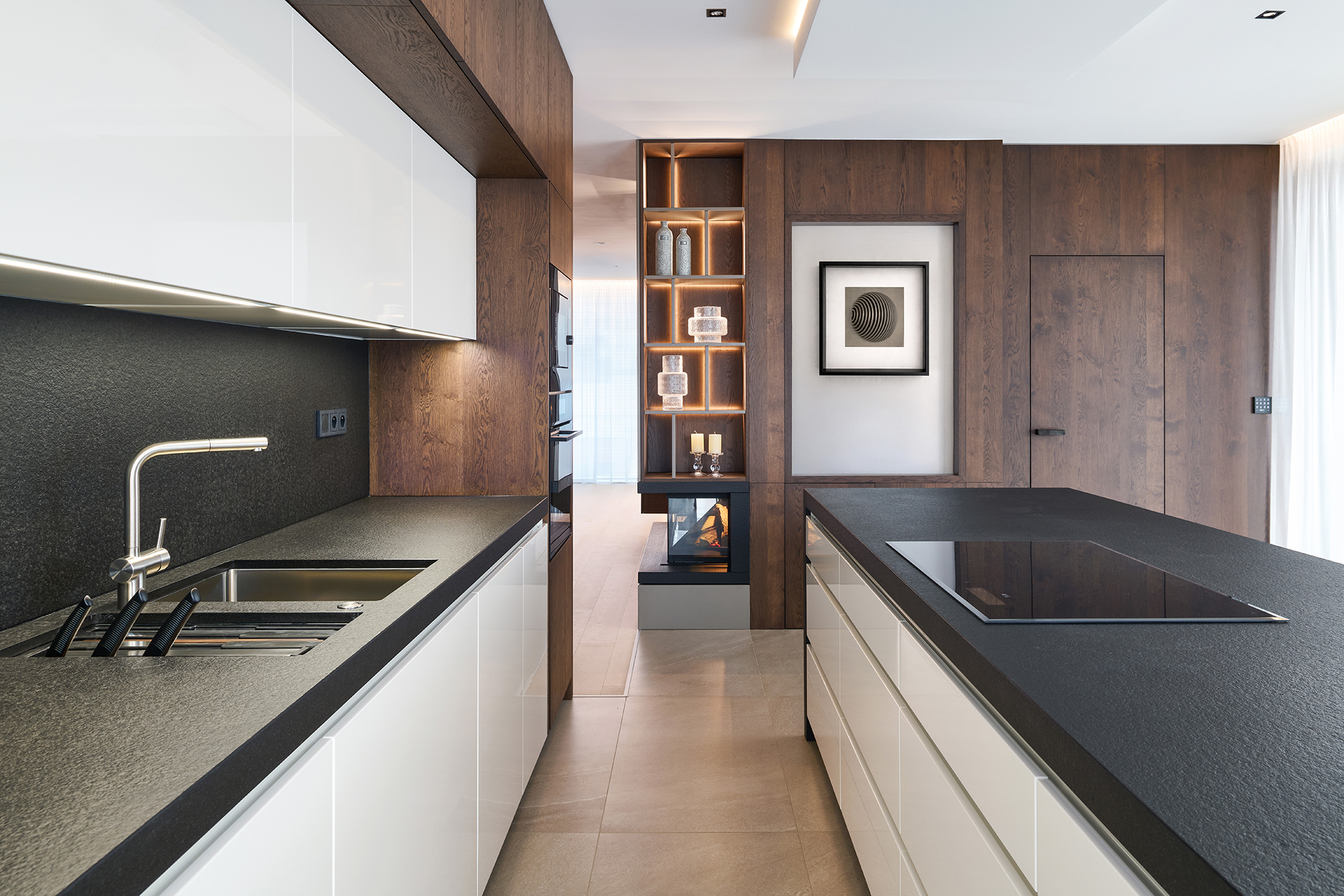 Kuchyně ELITE/LINE pracuje s jasnou a vyváženou kompozicí, v níž se bílý lak antik lesk, masivní kamenná deska Nero Zimbabwe a hřejivý dřevěný dekor přirozeně propojují v dokonalou souhru. Prosklené vitríny v titanových rámech s integrovaným LED osvětlením dodávají sestavě lehkost a hloubku, zatímco průhled do krbu, organicky začleněný do nábytku, vnáší do designu teplo a galerijní prvek.