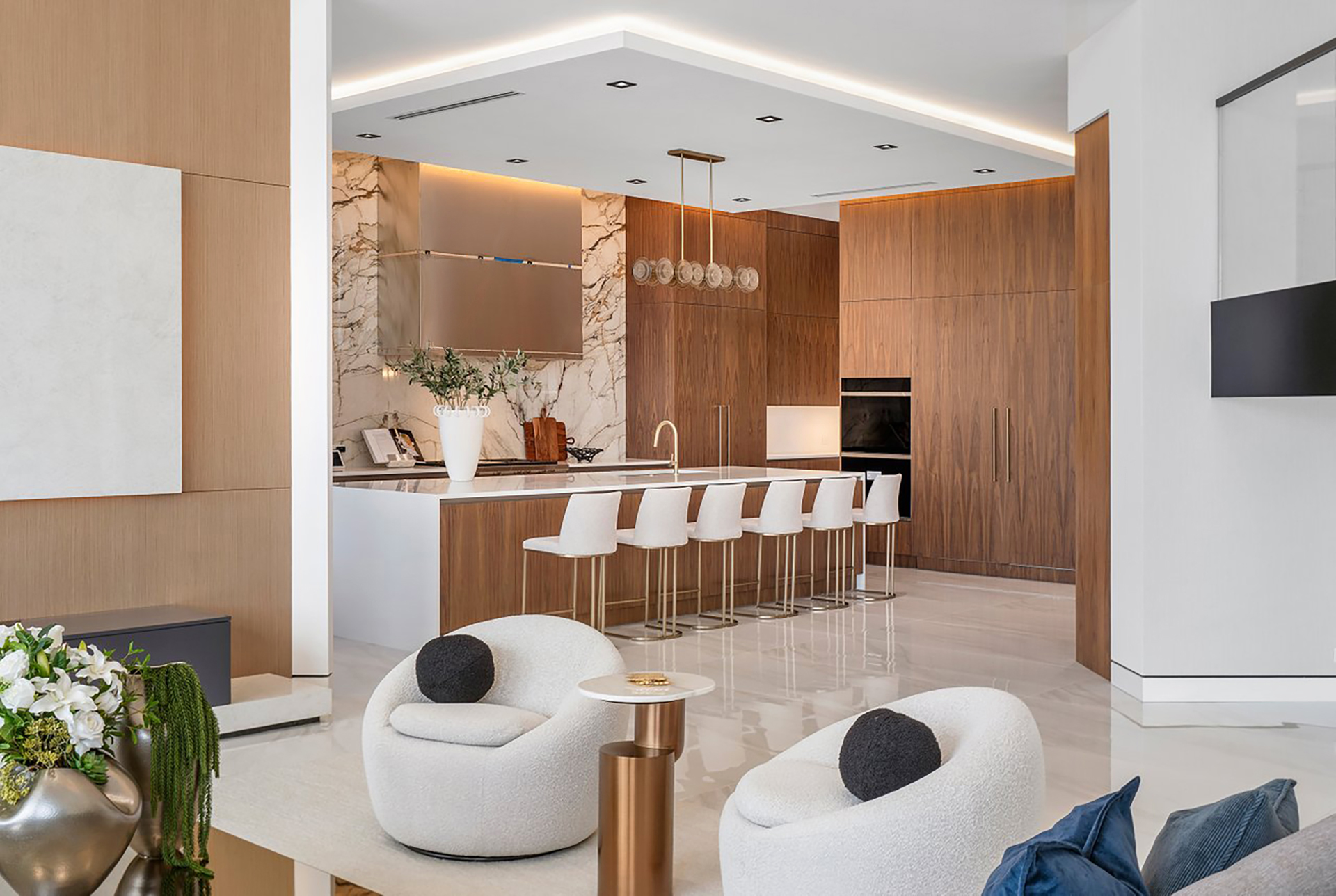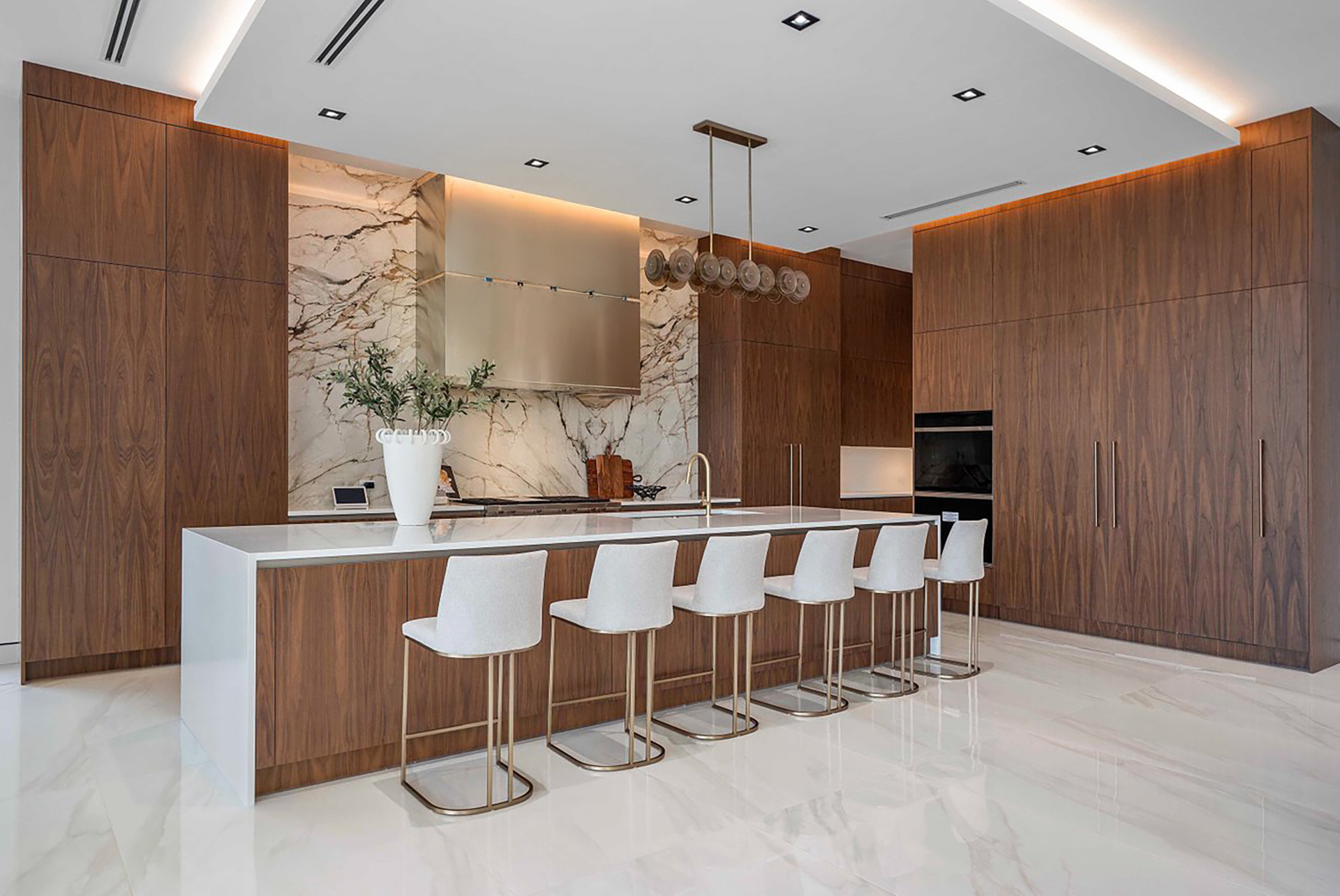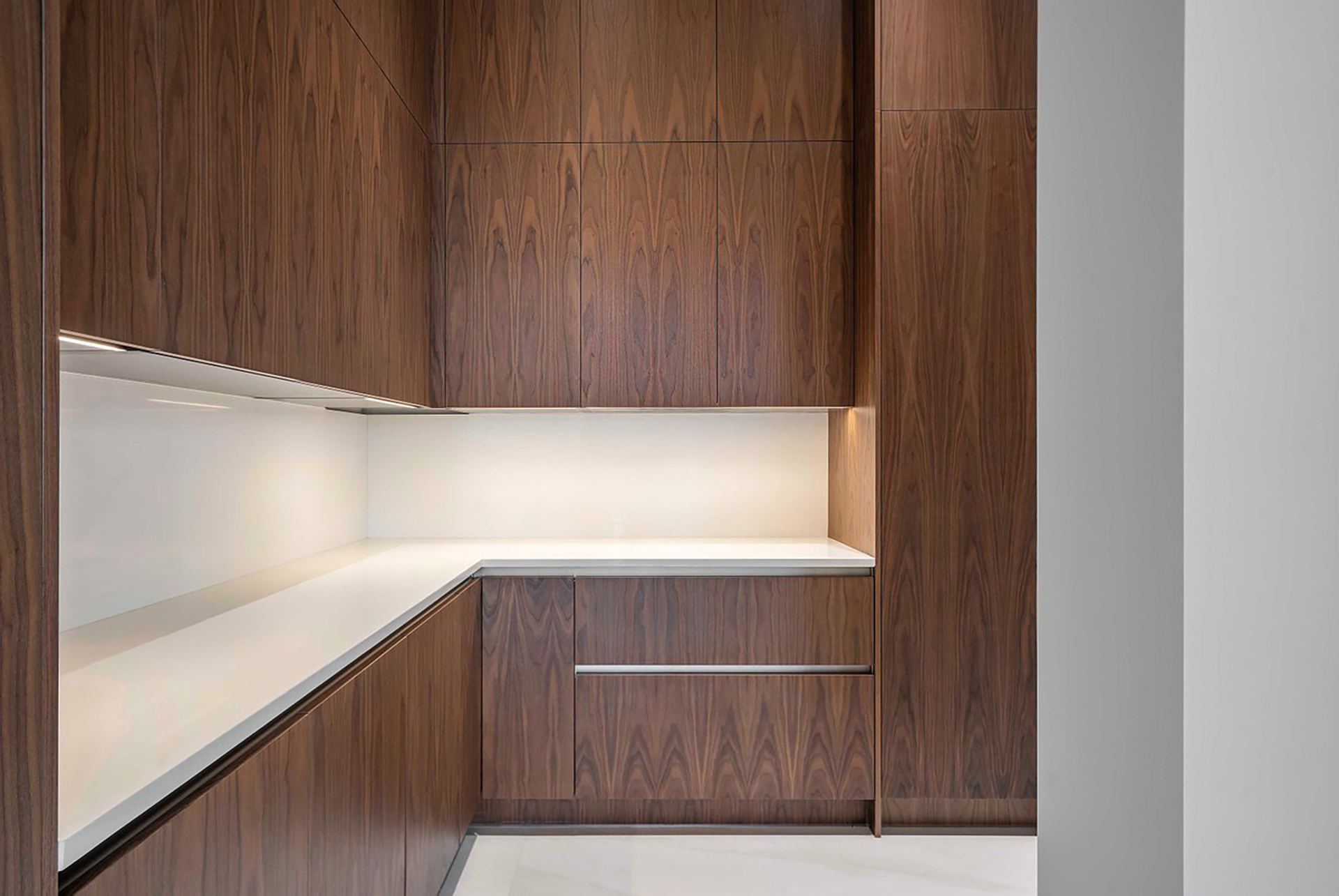 Interiér této rezidence je postaven na precizně navrženém nábytku na míru, který propojuje kvalitní materiály, pečlivé řemeslné zpracování a nadčasový design. Dominantním prvkem celého prostoru je dýha amerického ořechu, jejíž výrazná kresba dodává interiéru eleganci a přirozené teplo. V kombinaci s lakovanými plochami v odstínech Polar White lesk a Black matt vzniká vyvážená materiálová kompozice s kultivovaným, luxusním charakterem.
