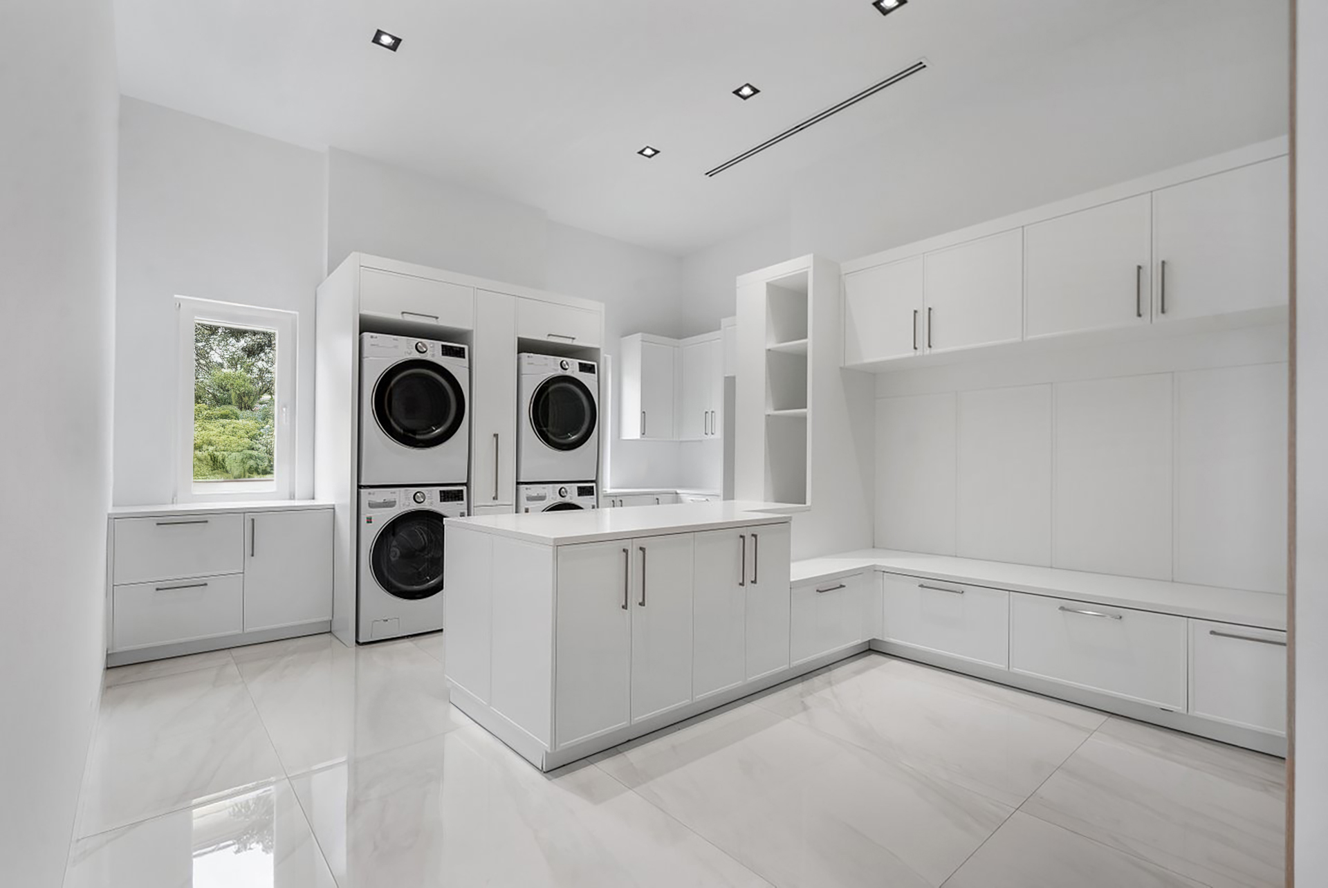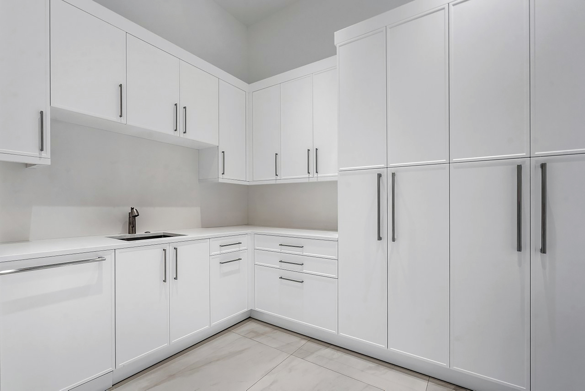 Kuchyň s barem v provedení ELITE/LINE tvoří přirozené centrum společenské části domu. Čisté linie, minimalistické řešení a precizní návaznost jednotlivých materiálů vytvářejí klidný, reprezentativní prostor s důrazem na detail. Na hlavní obytnou část plynule navazují další místnosti – spižírna, prádelna a pět koupelen, které spojuje jednotný design i důsledná materiálová kontinuita.