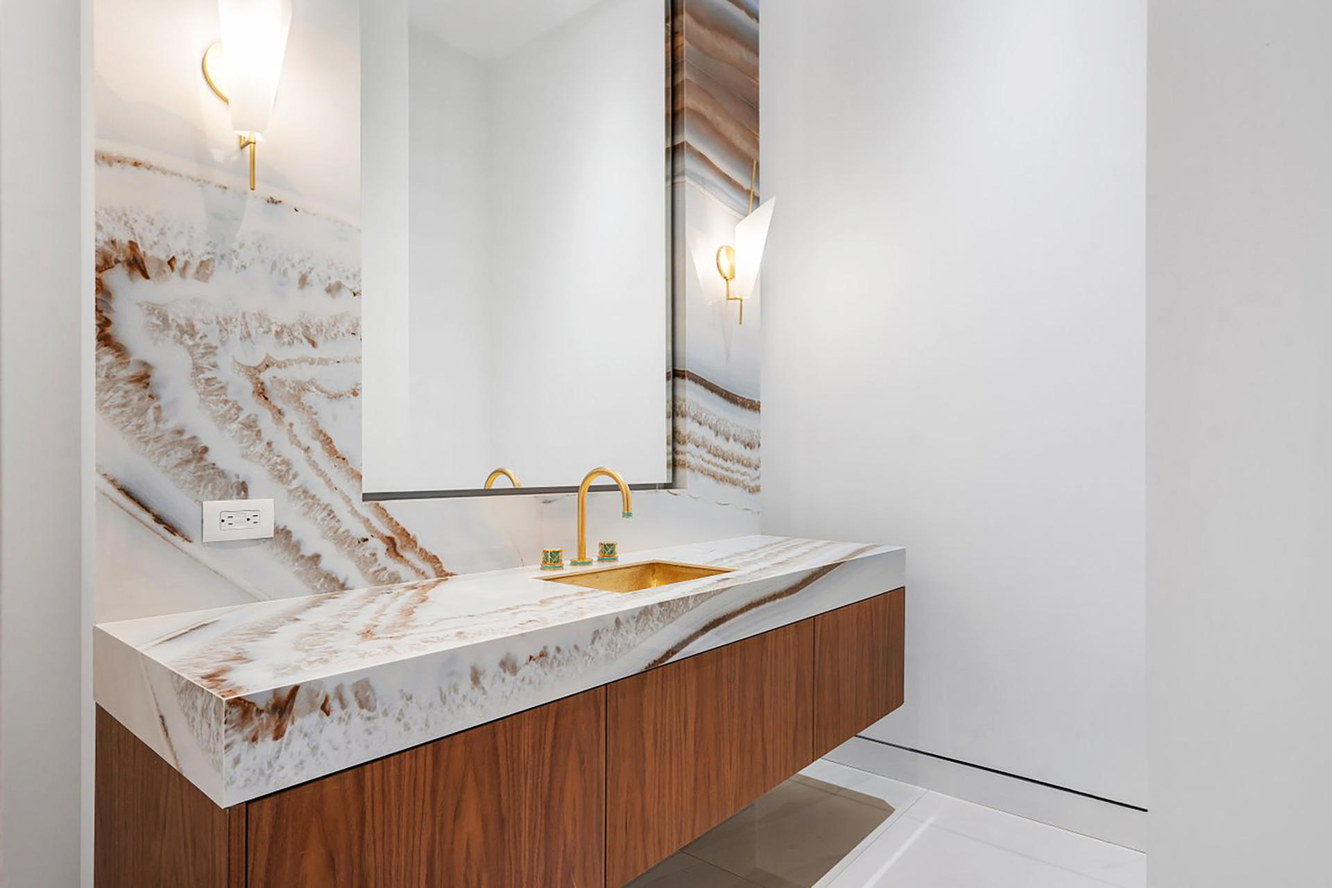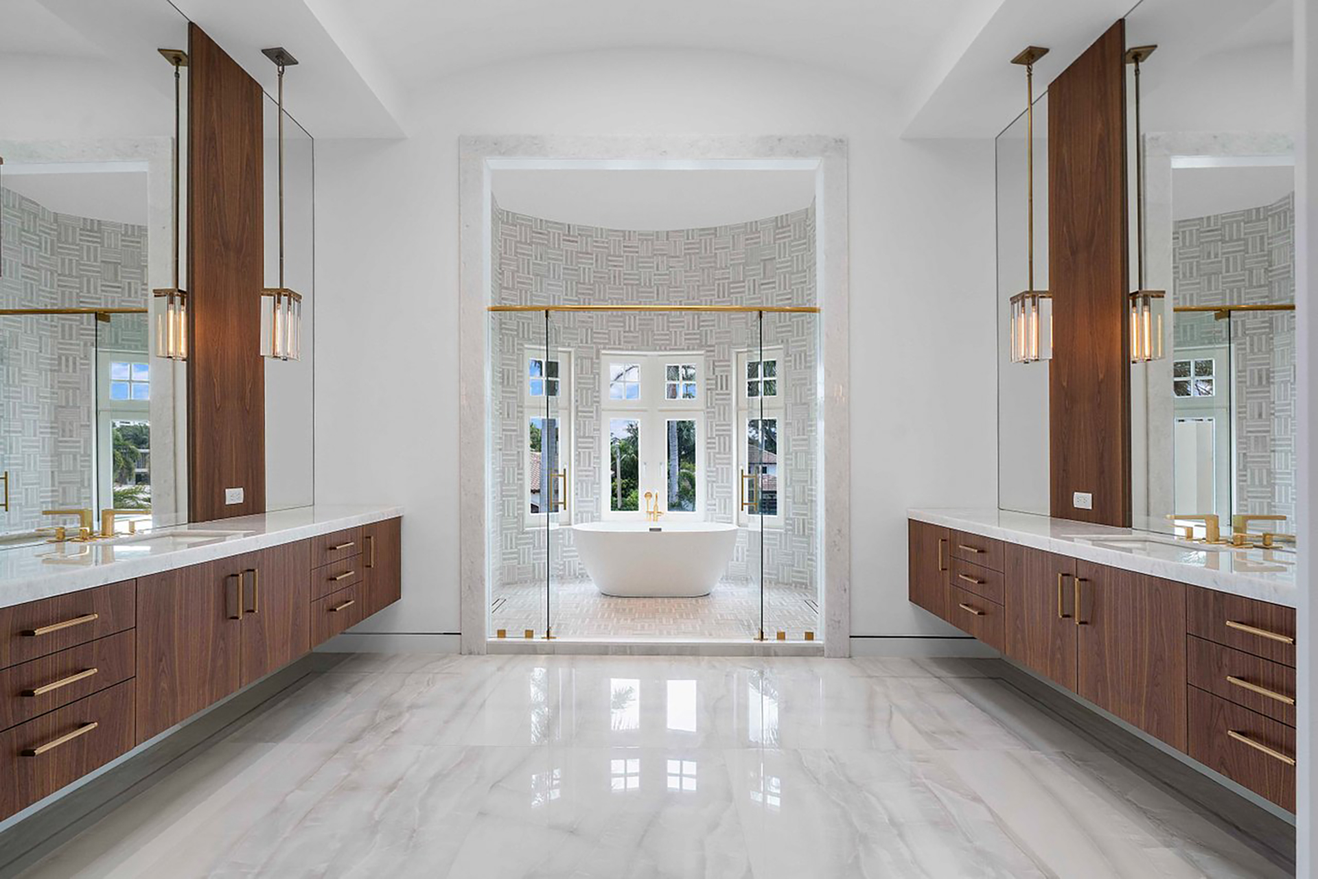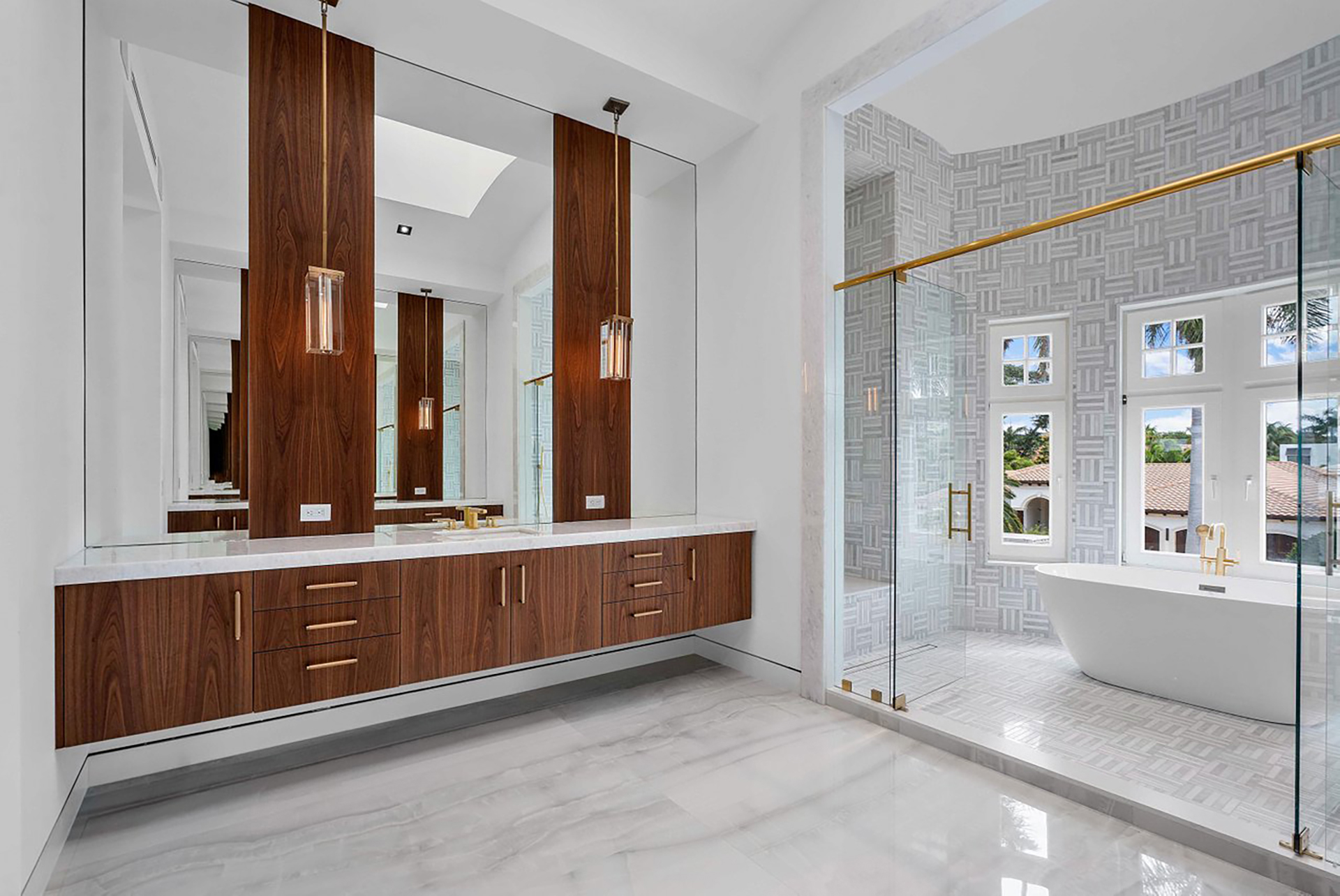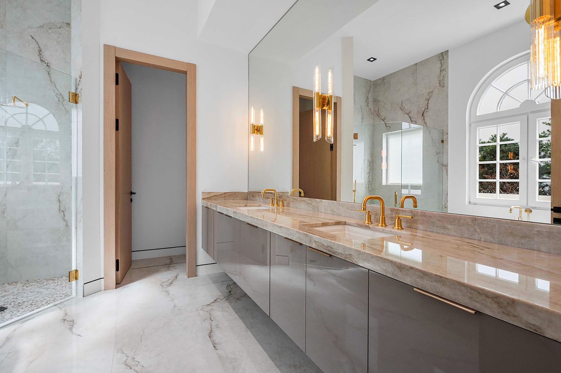 V koupelnách se kombinují lakované povrchy s dýhou amerického ořechu a kartáčovanou dýhou Champagne, která interiéru dodává jemnou strukturu a hloubku. Celek působí harmonicky a podtrhuje atmosféru klidného, luxusního bydlení s důrazem na kvalitu každého detailu.