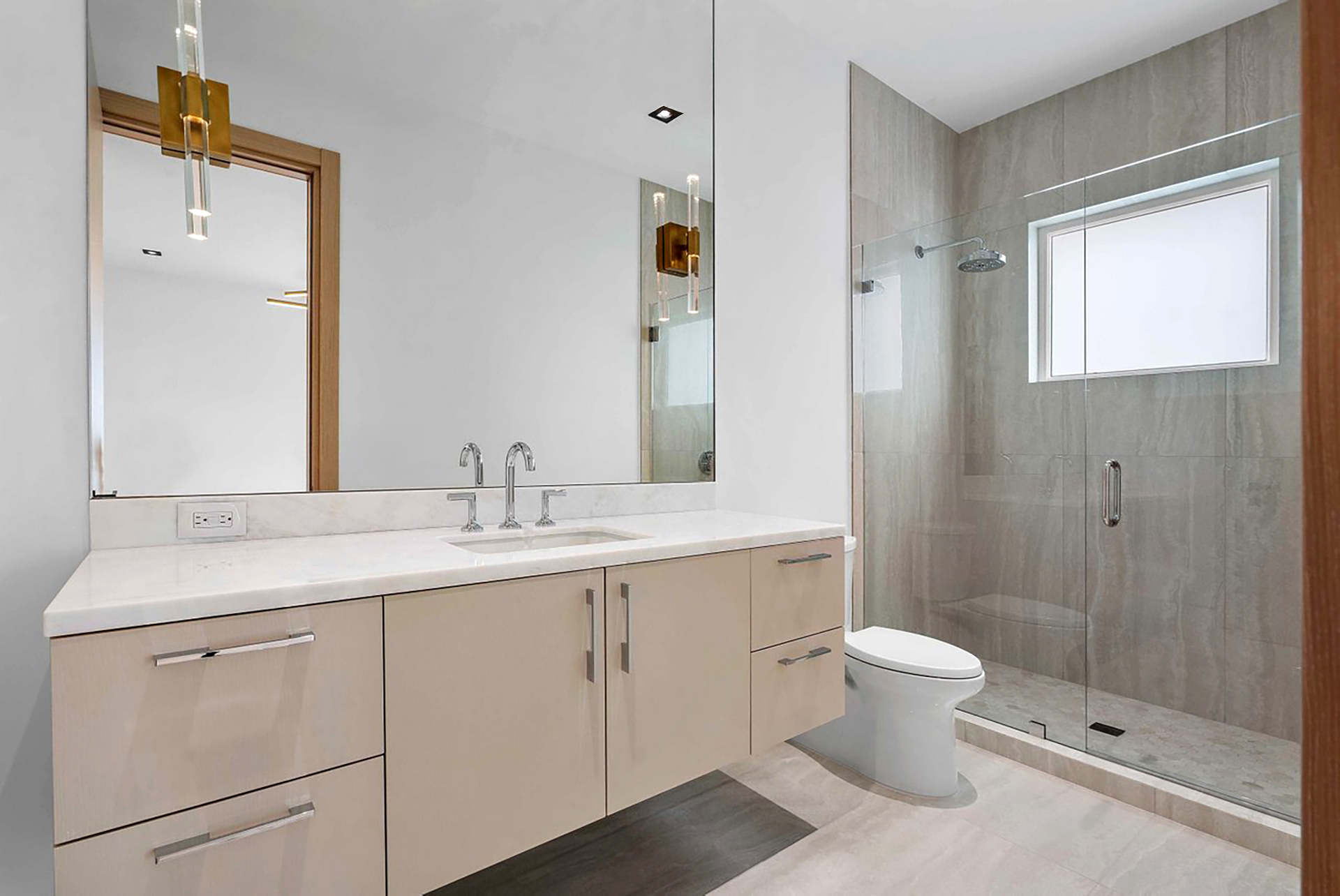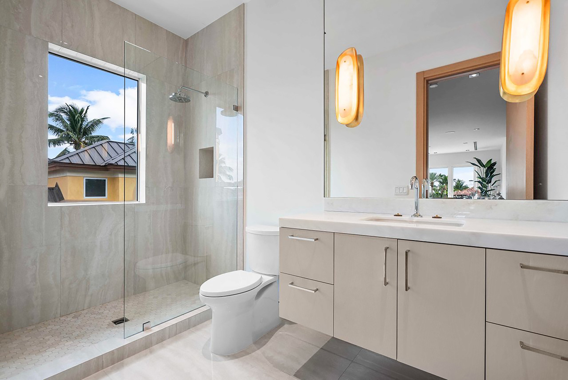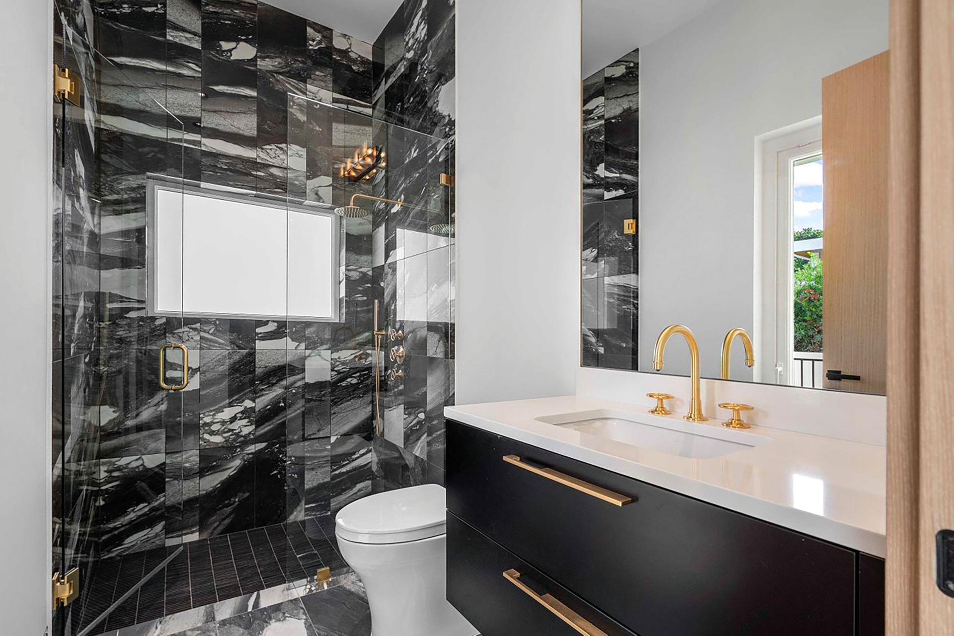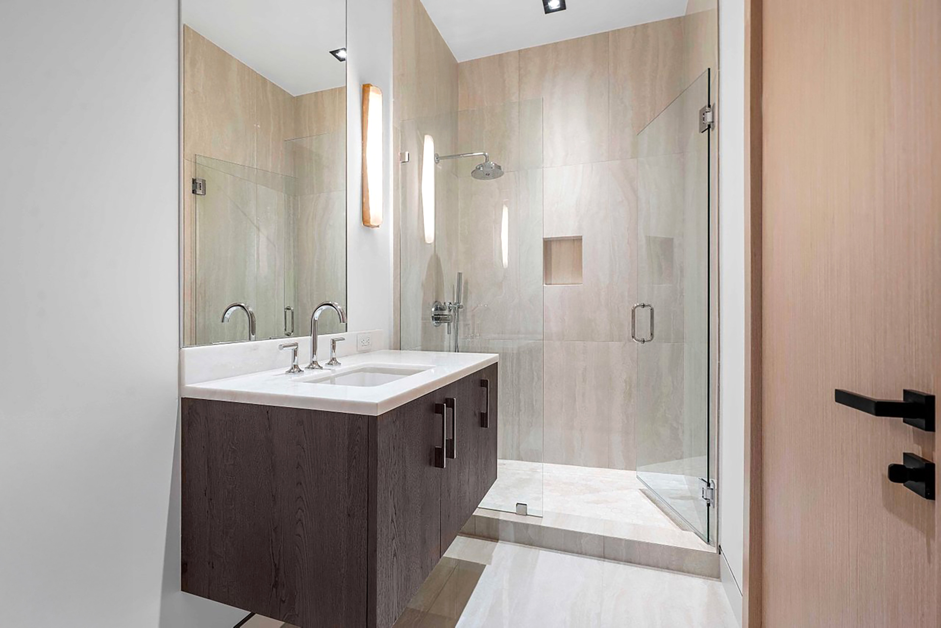 V koupelnách se kombinují lakované povrchy s dýhou amerického ořechu a kartáčovanou dýhou Champagne, která interiéru dodává jemnou strukturu a hloubku. Celek působí harmonicky a podtrhuje atmosféru klidného, luxusního bydlení s důrazem na kvalitu každého detailu.
