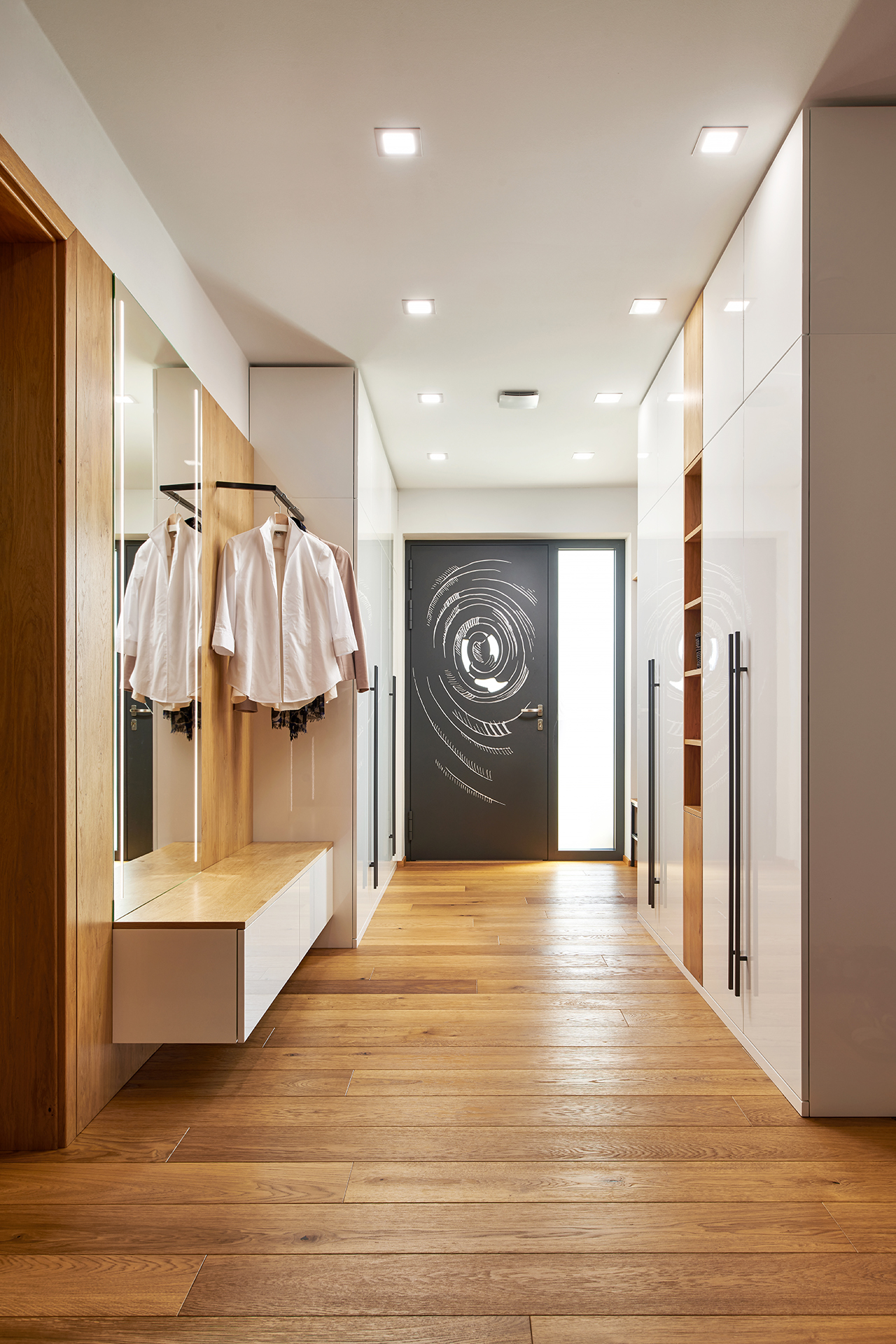 Šatna a šatní skříně z dubové dýhy v harmonickém interiéru
