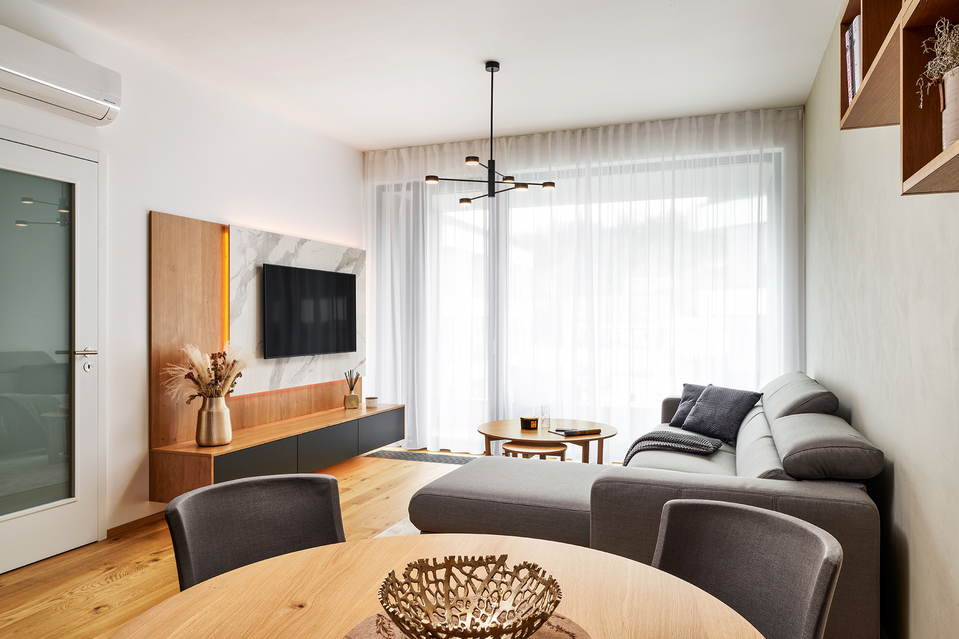 Скамья с мягкой обивкой в интерьере с закругленными линиями