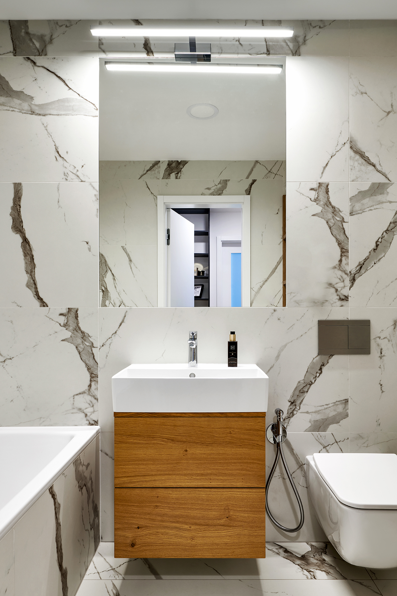 Реализация ванной комнаты в нежных оттенках шампанского и дерева