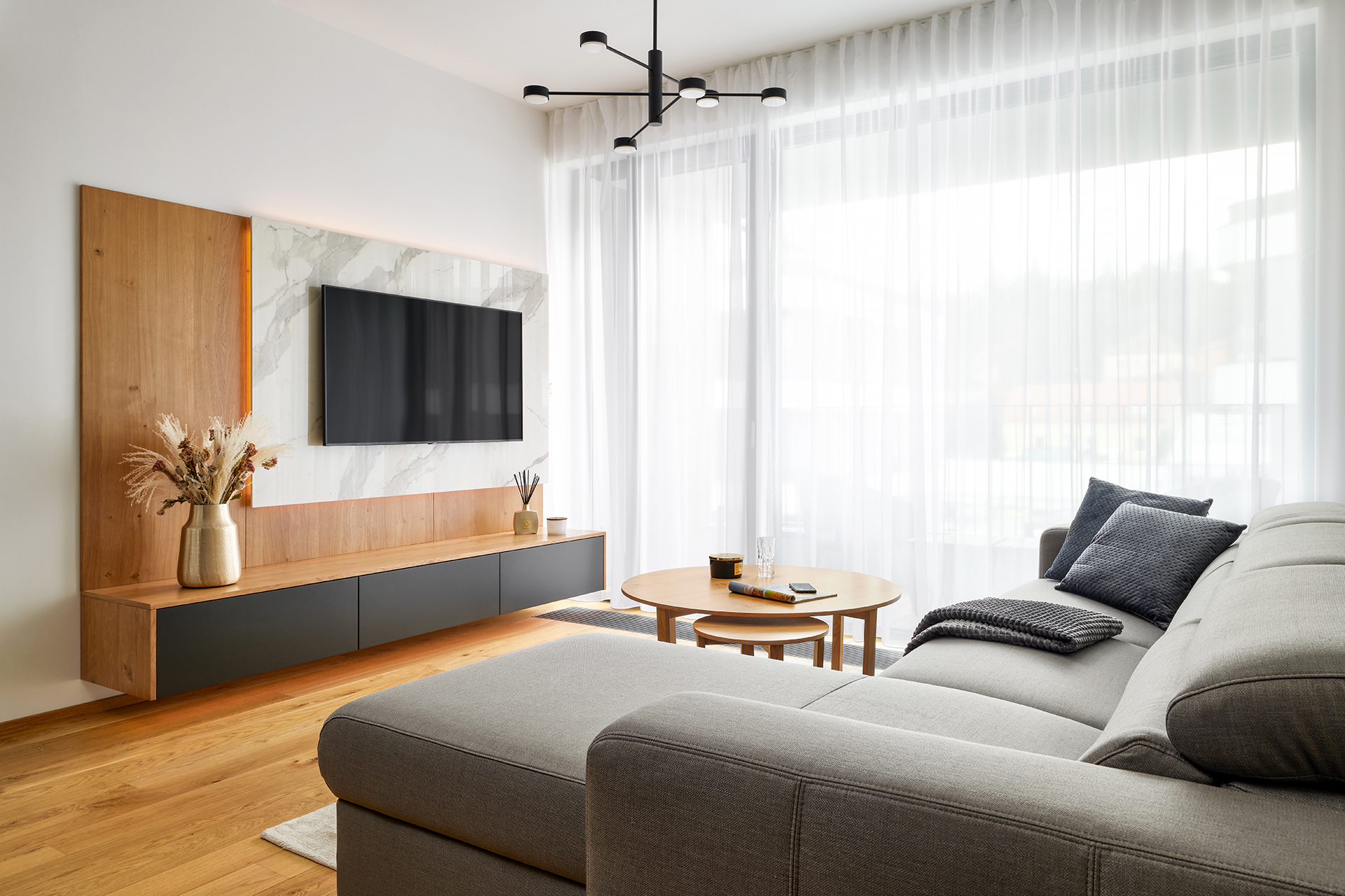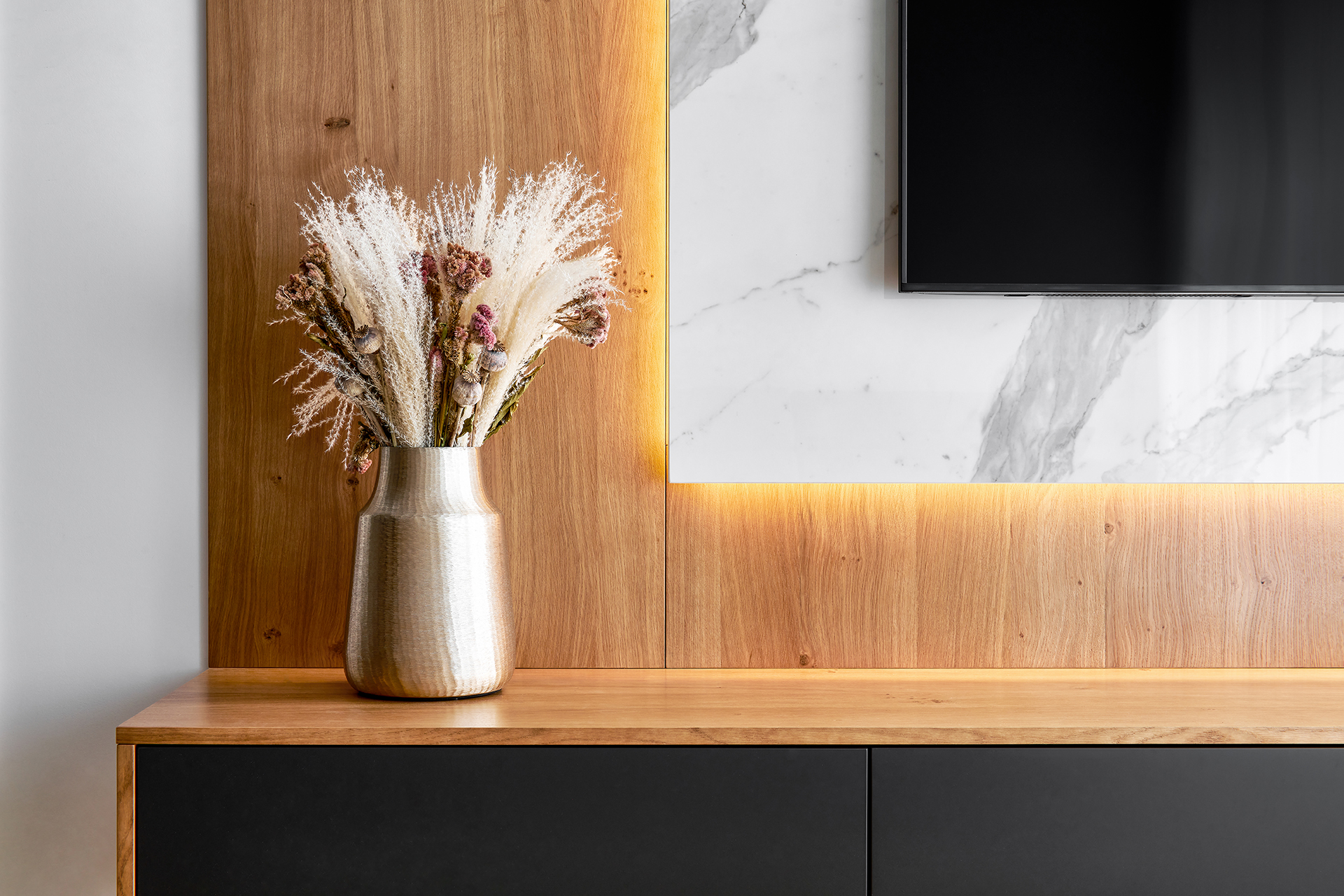 Эстетическим центром комнаты является телевизионная стена, для которой была использована комбинация теплого шпона дуба rustikál old и роскошных керамических плит Laminam Statuario. Эта композиция, дополненная элегантным подвесным модулем для хранения и сдержанной подсветкой, придает помещению утонченный и неподвластный времени характер. Общее впечатление чистых линий и функциональности делает эту гостиную идеальным местом для ежедневного отдыха.