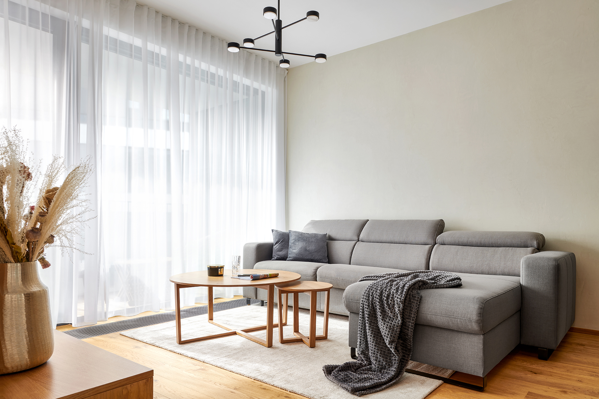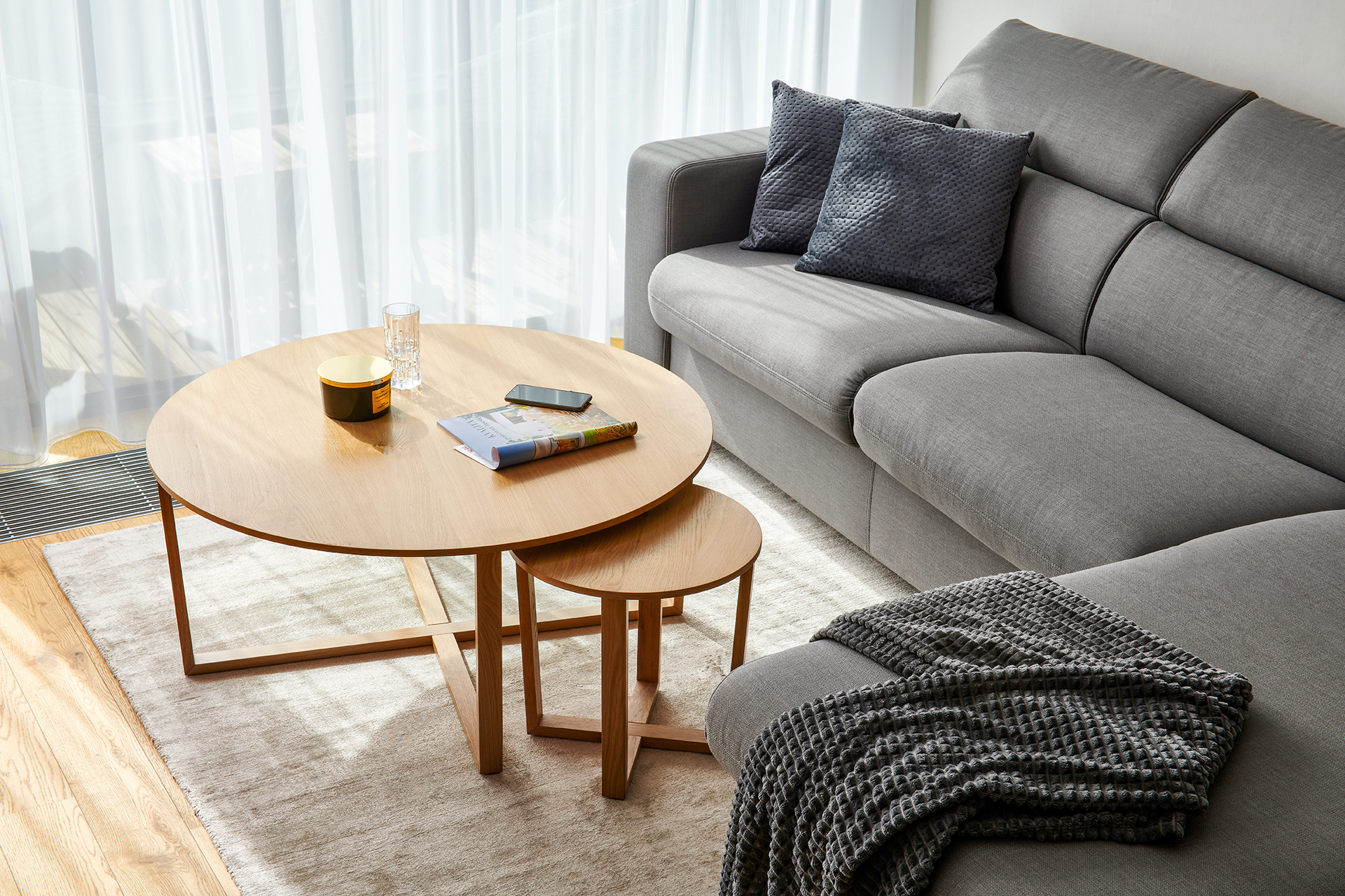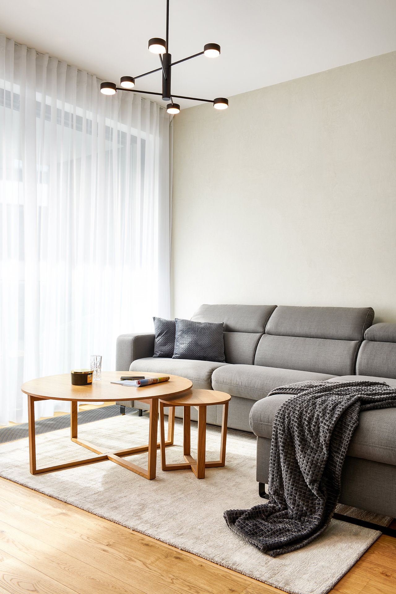 Этот проект гостиной мастерски сочетает в себе воздушный и современный дизайн с акцентом на высококачественные материалы. Интерьер очень со вкусом доминирует комфортабельный диван B.E.D. с раскладкой и набор круглых журнальных столиков модели KS18, которые подчеркивают уютную атмосферу.