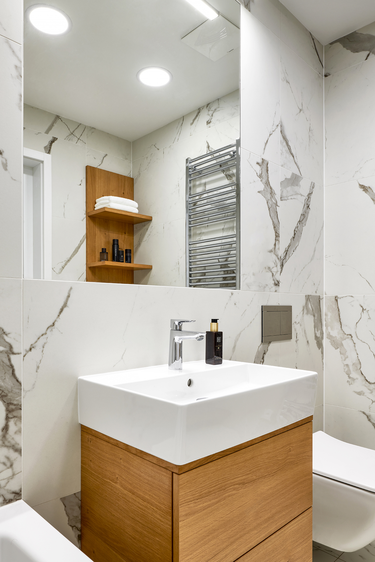 Благодаря точному освещению и минималистичным сантехническим элементам эта ванная комната становится не только функциональным, но и, прежде всего, расслабляющим пространством для ежедневных ритуалов.