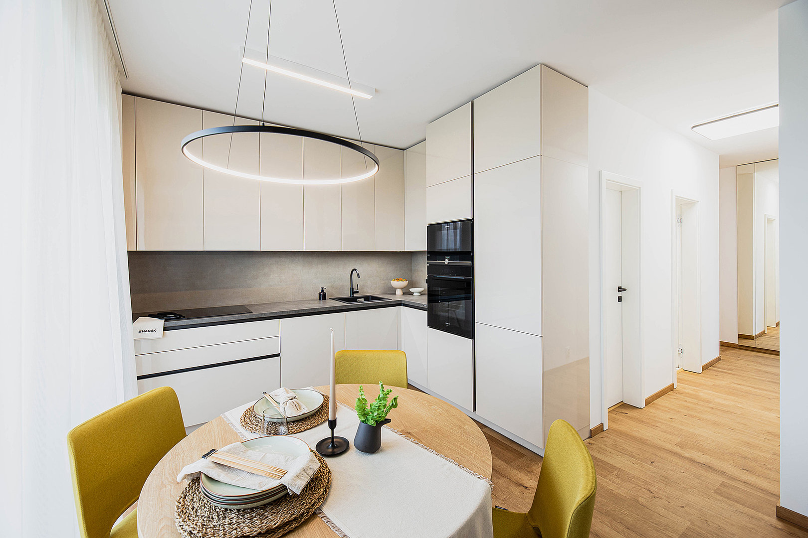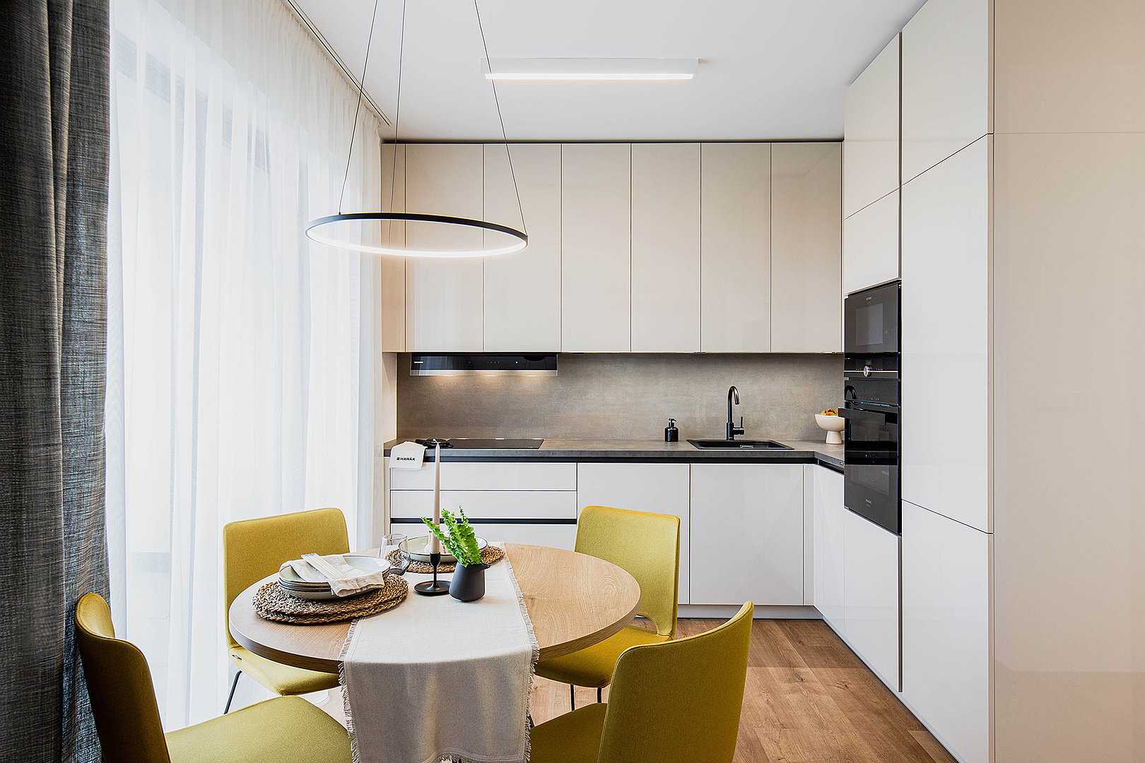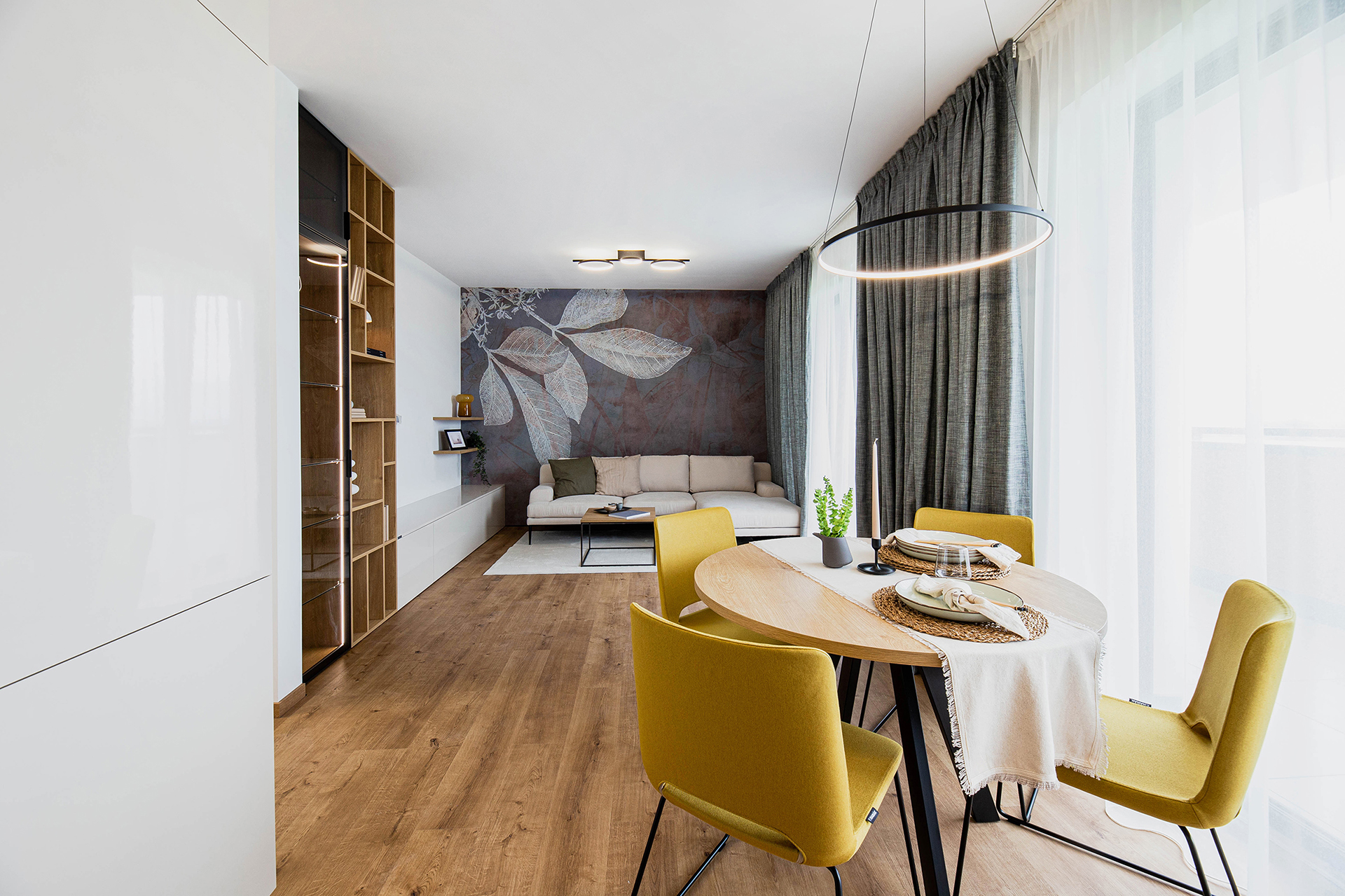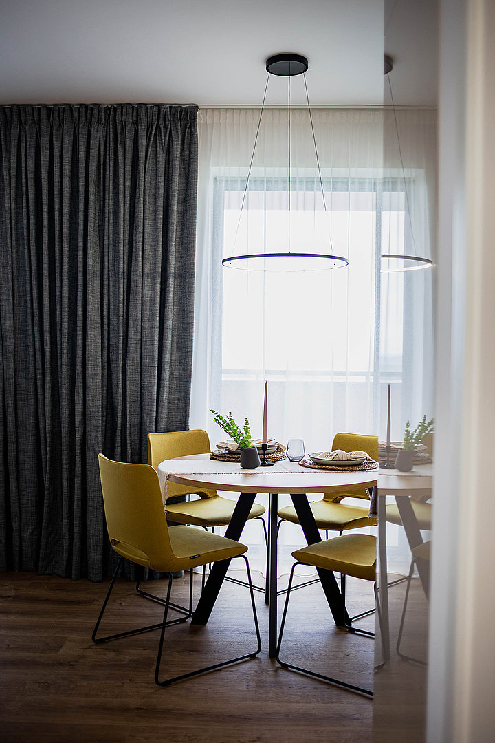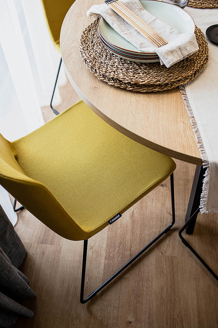 Spojenie s jedálenským kútom zabezpečuje okrúhly drevený stôl, ktorý vďaka prírodnému materiálu prináša do interiéru útulnosť a rovnováhu. Pohodlné stoličky DUNA v horčicovožltom odtieni sú osviežujúcim prvkom – farebným detailom, ktorý príjemne oživuje priestor a dodáva mu pozitívnu energiu. Atmosféru dopĺňajú moderné kruhové závesné svietidlá, ktoré vytvárajú príjemnú intímnu svetelnú scénu nad jedálenským stolom.
