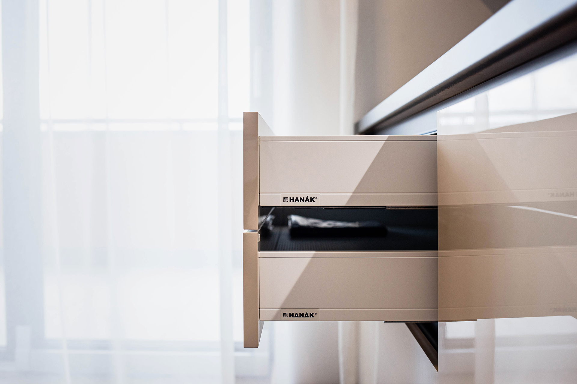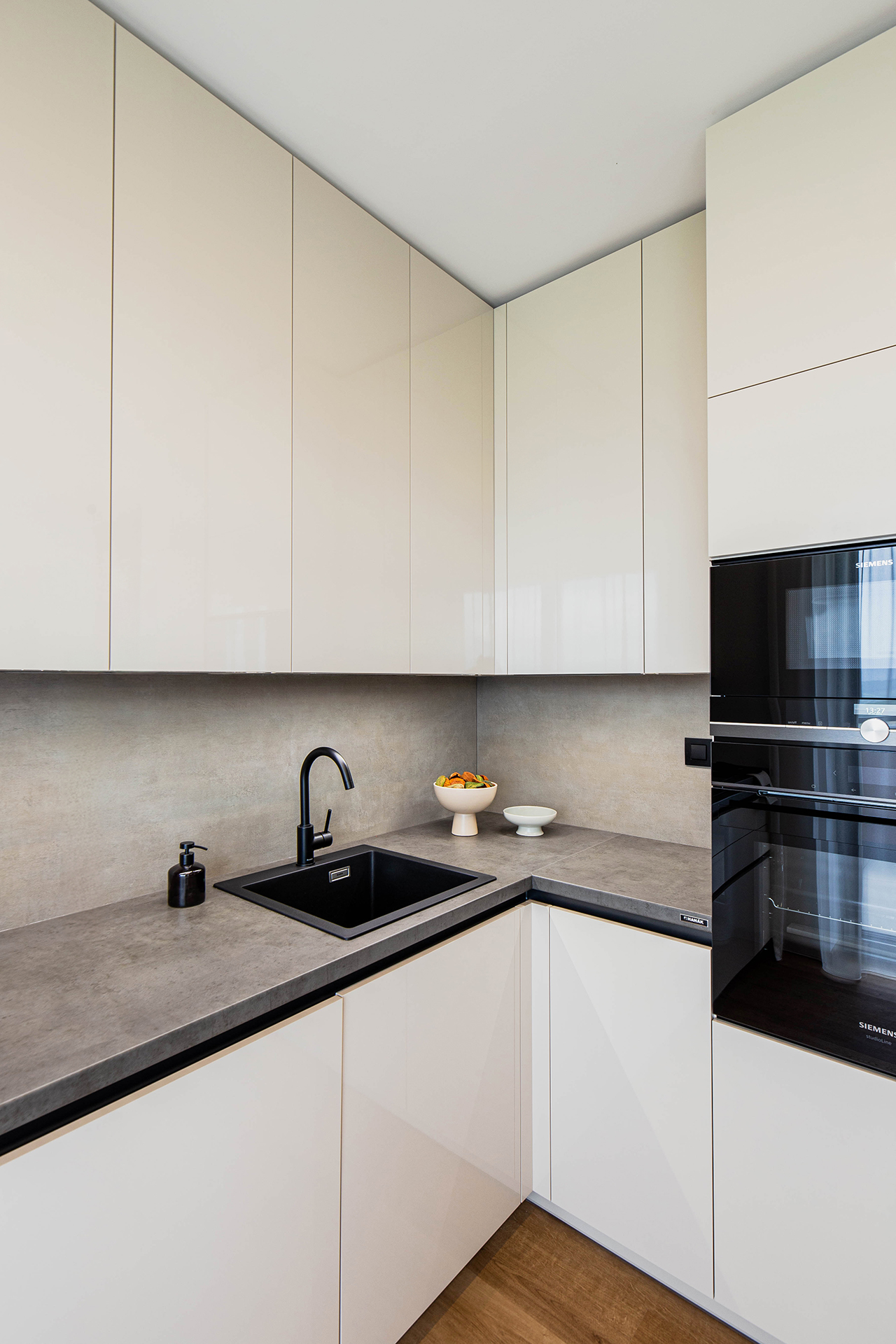 Kuchyňa nie je len miestom na varenie – je to miesto stretávania a každodenného života. Model ELITE v odtieni Champagne je toho dôkazom. Moderný dizajn sa zameriava na čisté línie a minimalistické riešenie bez úchytiek, ktoré opticky zväčšuje priestor a dodáva mu jemný nádych luxusu. Lesklé dvierka v teplom odtieni vytvárajú harmonický a ľahký základ, ktorý kontrastuje s tmavou pracovnou doskou a obkladom stien.