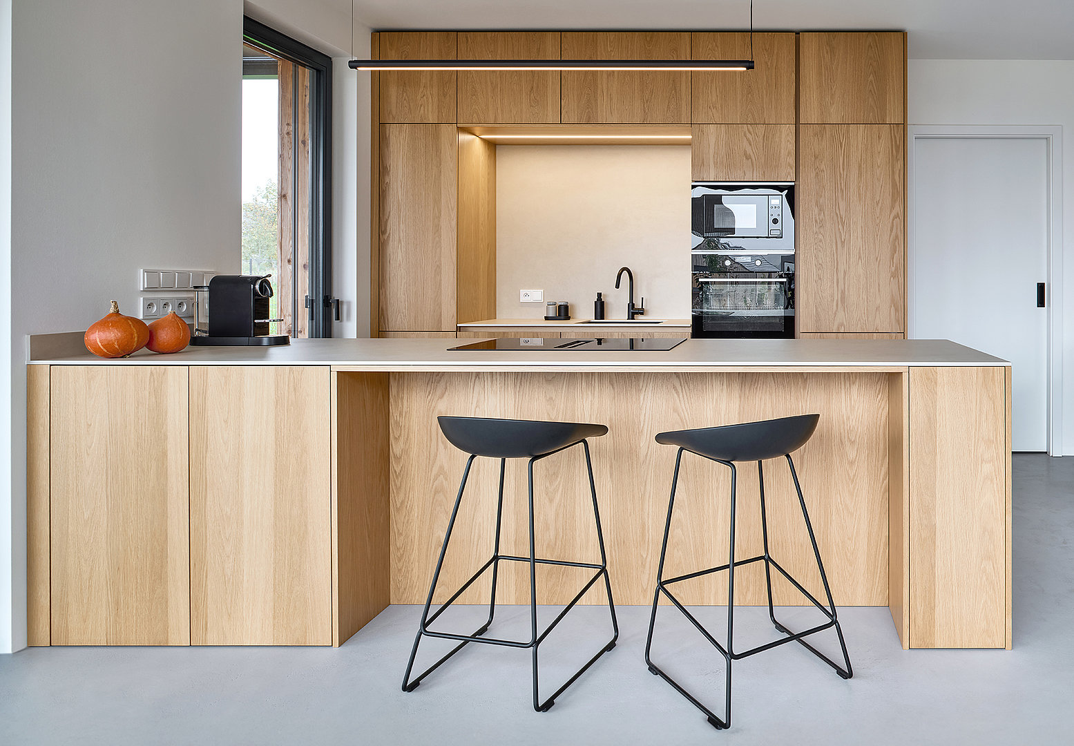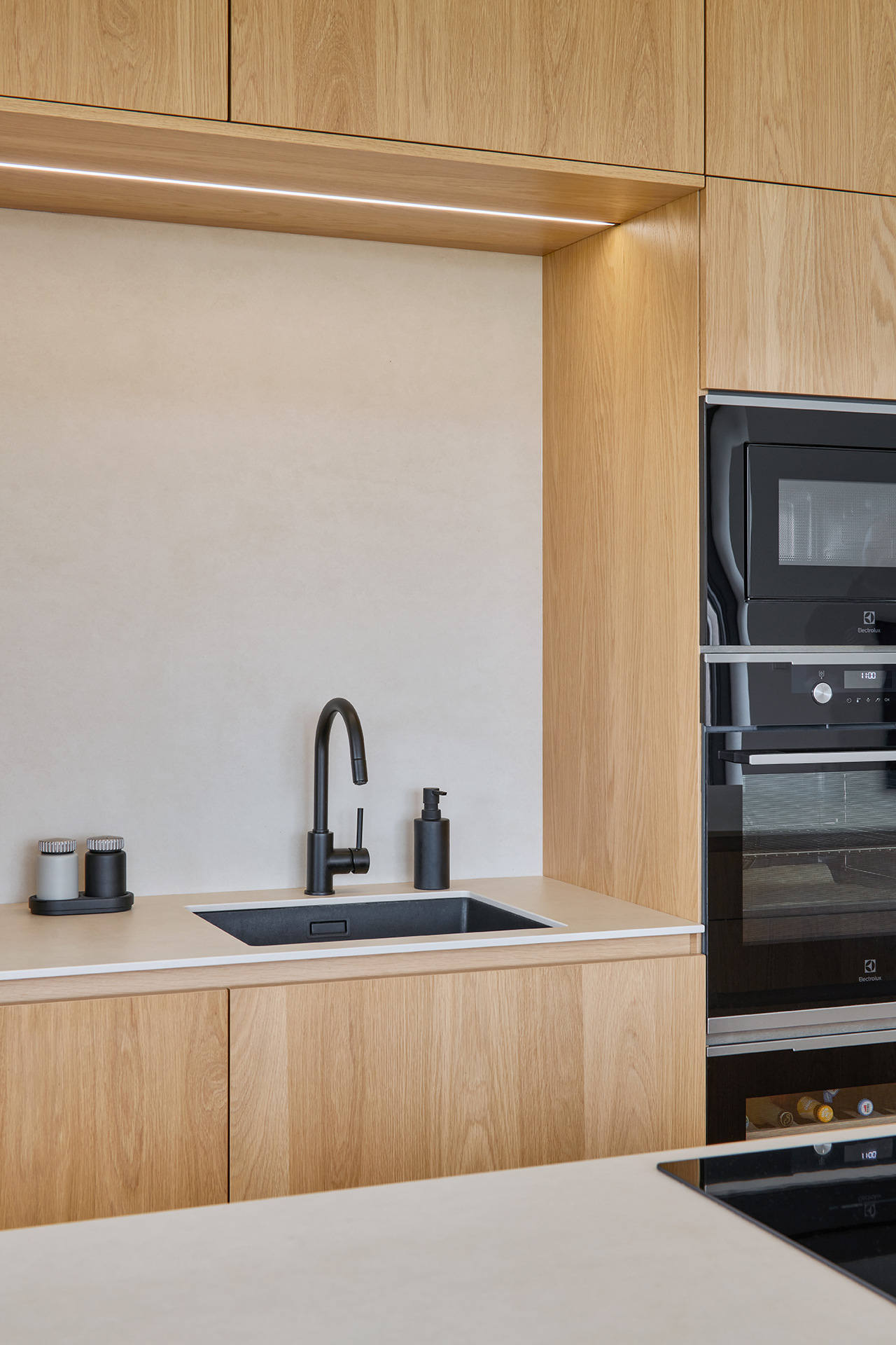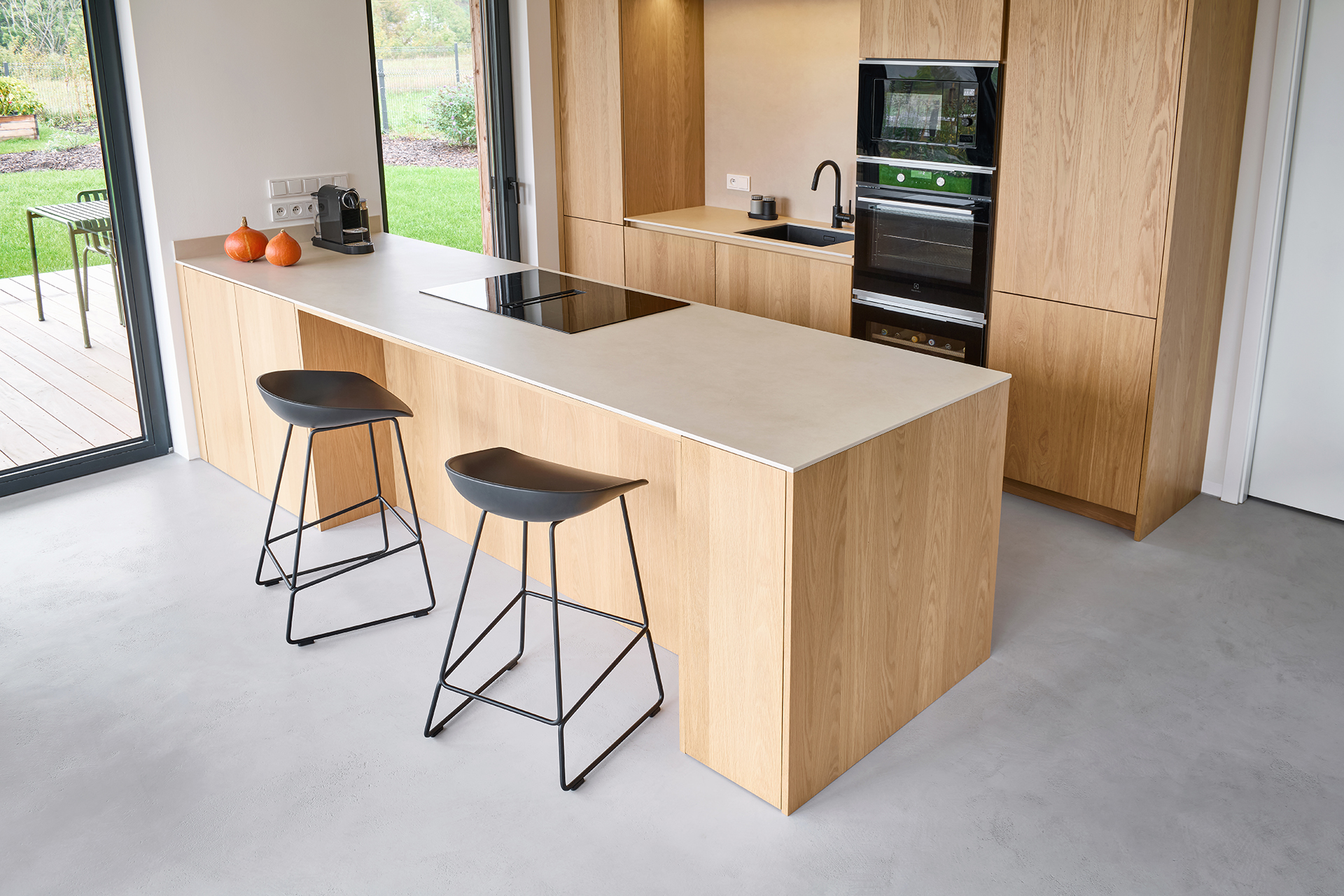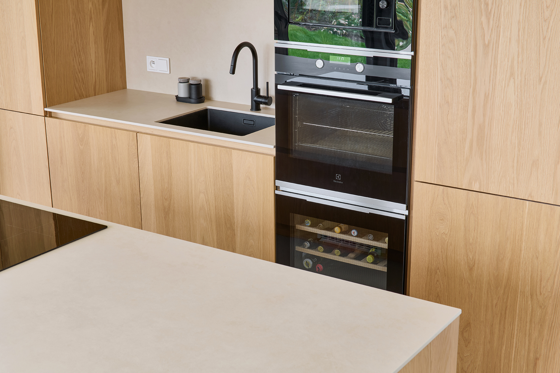 Kľúčovým prvkom je ultratenká keramická pracovná doska Dekton v odtieni Sasea, ktorá dodáva kuchyni ľahkosť a sofistikovanú eleganciu. Je nielen krásna, ale aj extrémne odolná voči poškriabaniu a teplu, čo z nej robí ideálneho partnera pre každodenné varenie. Praktická a zároveň pútavá je osvetlená pracovná nika s sofistikovaným osvetlením, ktorá nielen dokonale osvetľuje pracovnú plochu, ale slúži aj ako štýlový akcent. Centrálny kuchynský ostrovček tvorí prirodzené centrum pre stretávanie sa a rýchle jedlá. Zároveň elegantne spája kuchynský priestor s obývacou izbou a stáva sa ideálnym miestom na rannú kávu alebo večerný drink.