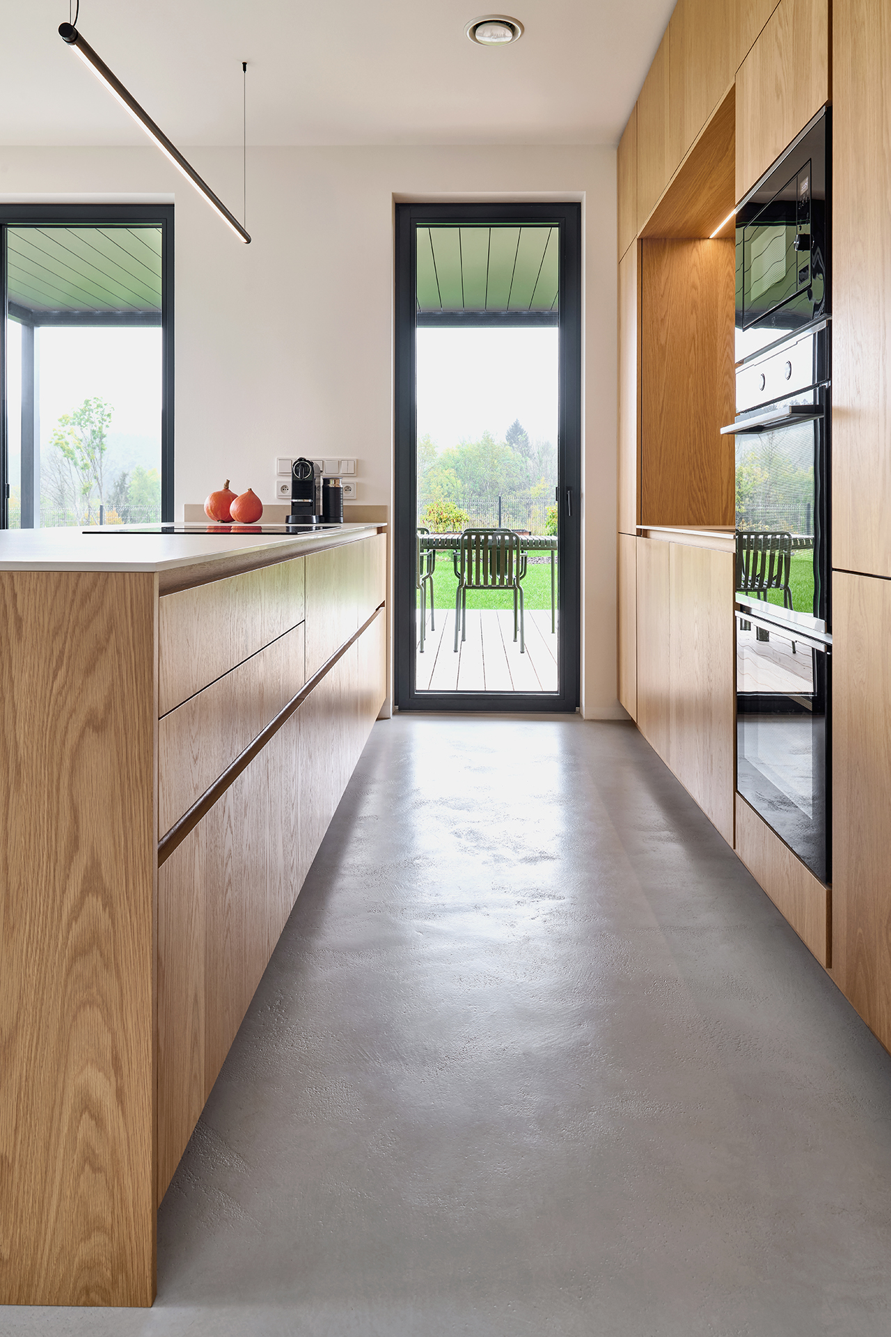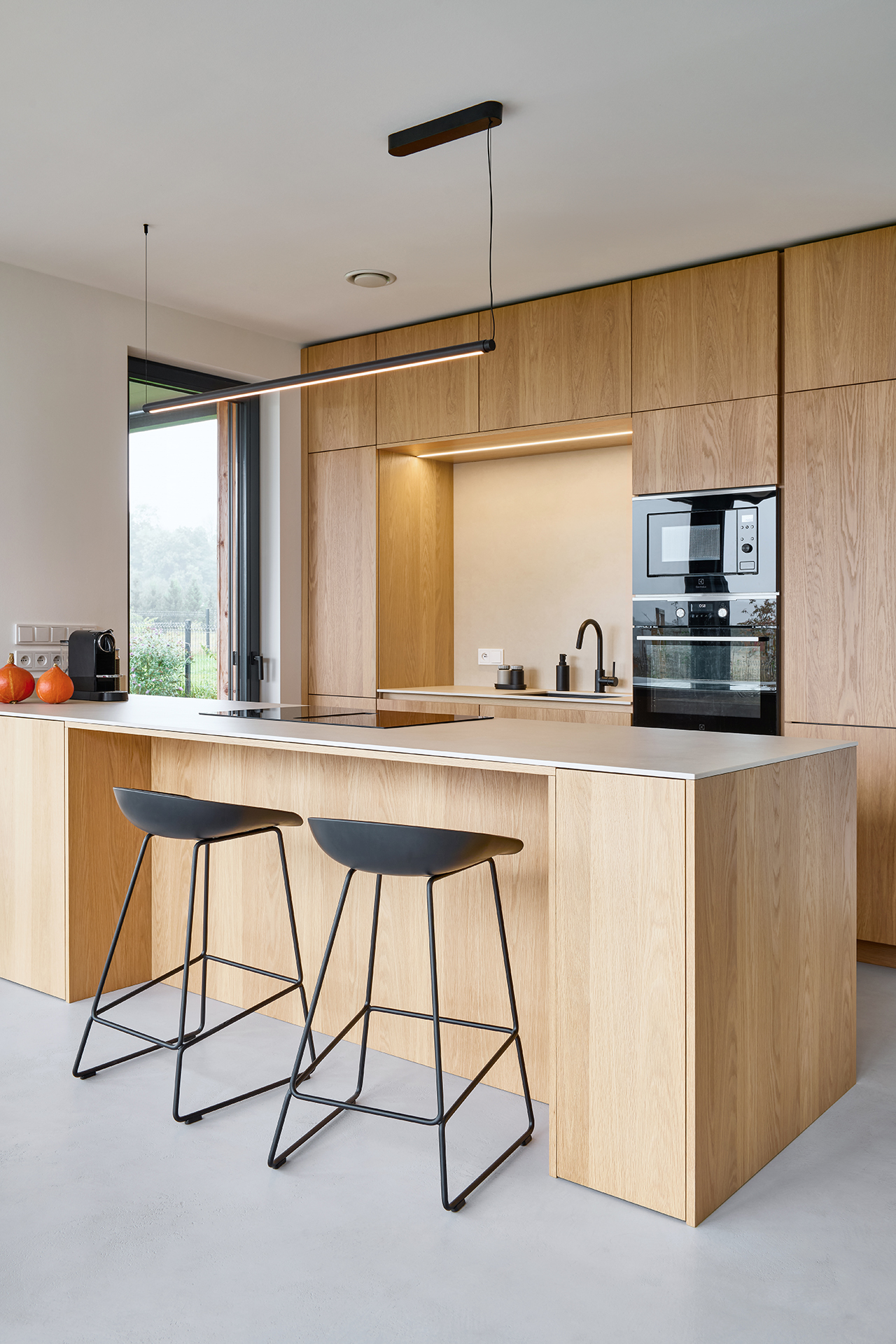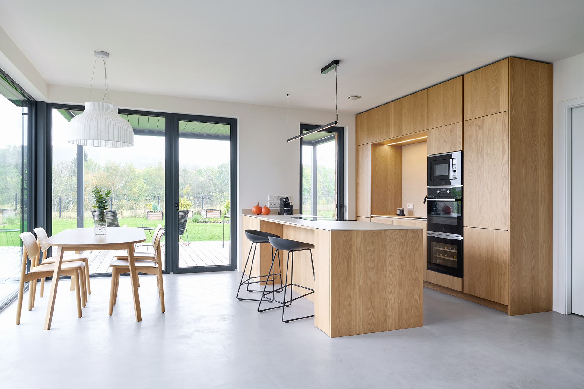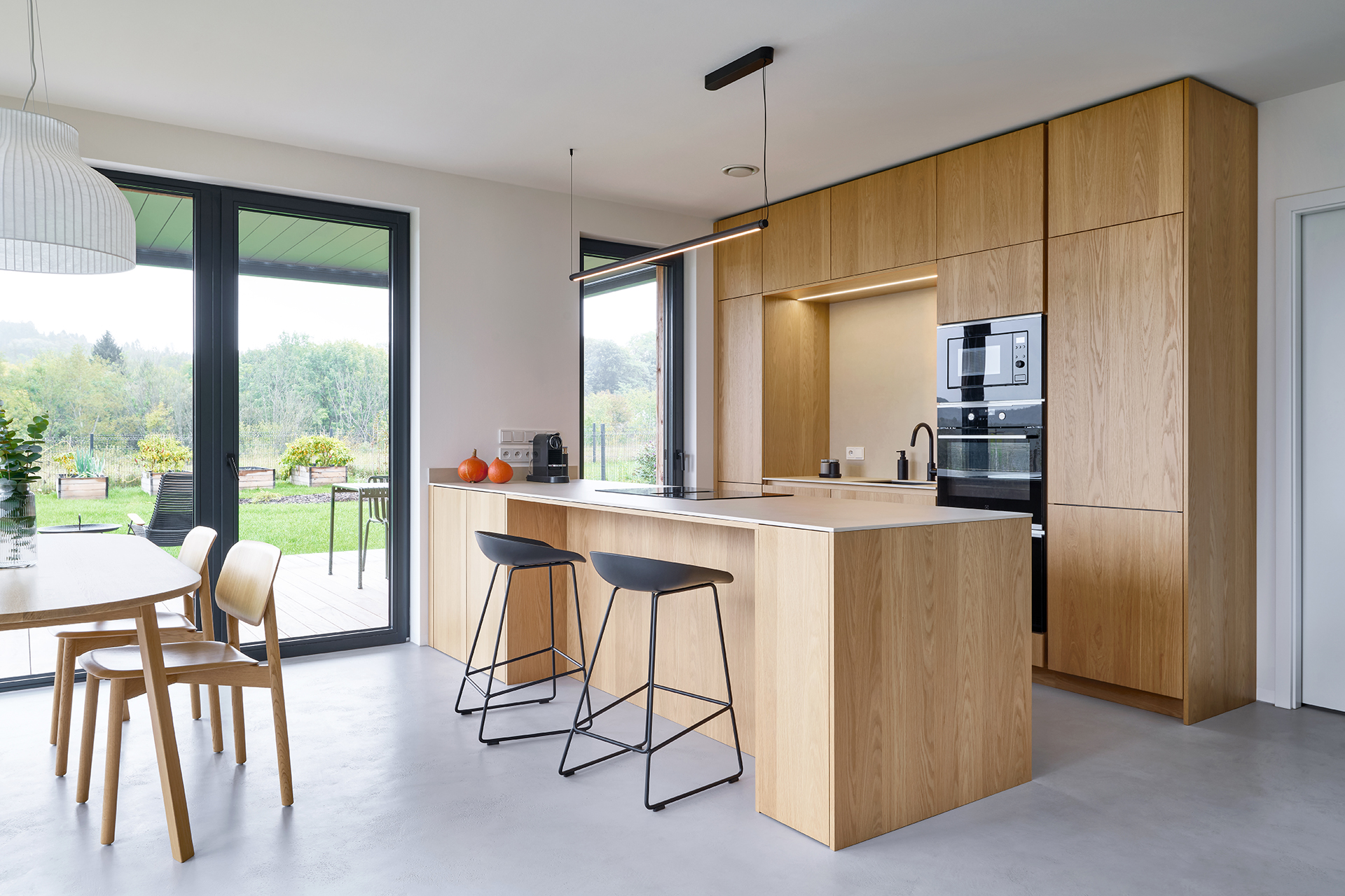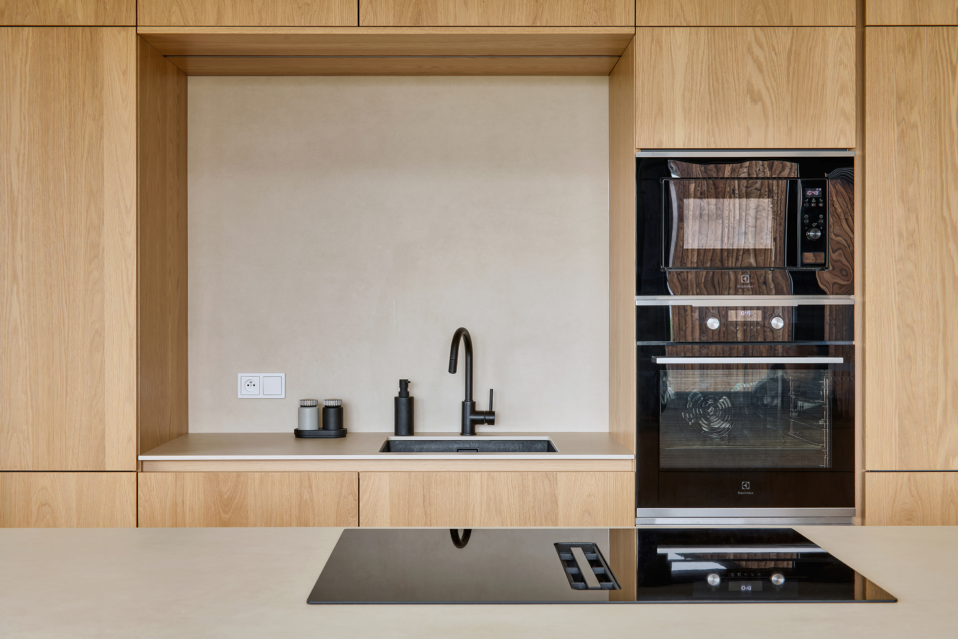 Kľúčovým prvkom je ultratenká keramická pracovná doska Dekton v odtieni Sasea, ktorá dodáva kuchyni ľahkosť a sofistikovanú eleganciu. Je nielen krásna, ale aj extrémne odolná voči poškriabaniu a teplu, čo z nej robí ideálneho partnera pre každodenné varenie. Praktická a zároveň pútavá je osvetlená pracovná nika s sofistikovaným osvetlením, ktorá nielen dokonale osvetľuje pracovnú plochu, ale slúži aj ako štýlový akcent. Centrálny kuchynský ostrovček tvorí prirodzené centrum pre stretávanie sa a rýchle jedlá. Zároveň elegantne spája kuchynský priestor s obývacou izbou a stáva sa ideálnym miestom na rannú kávu alebo večerný drink.