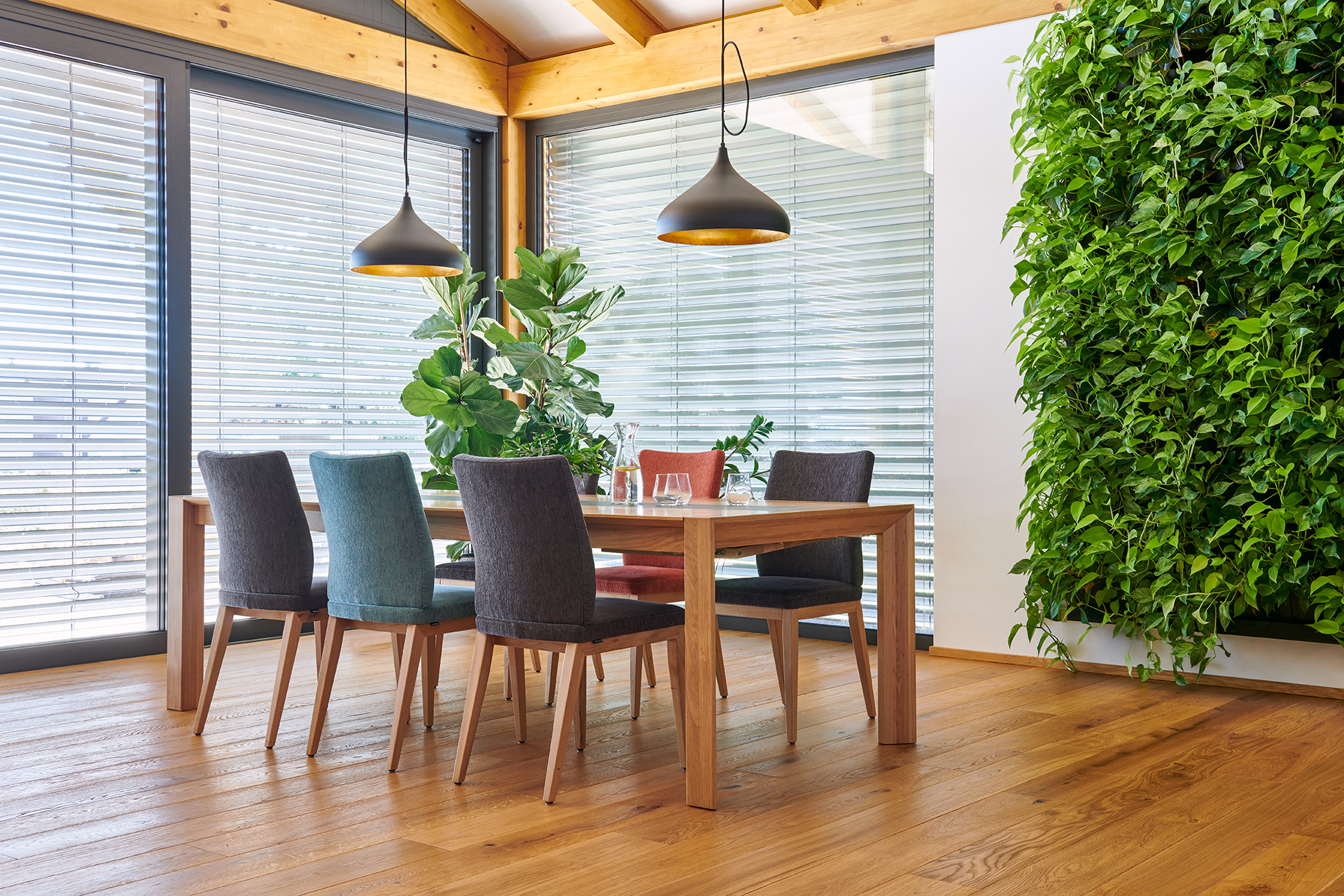 Veľkoformátové okná a sklenené steny otvárajú celý priestor a ponúkajú krásny výhľad do záhrady a dostatok prirodzeného svetla.