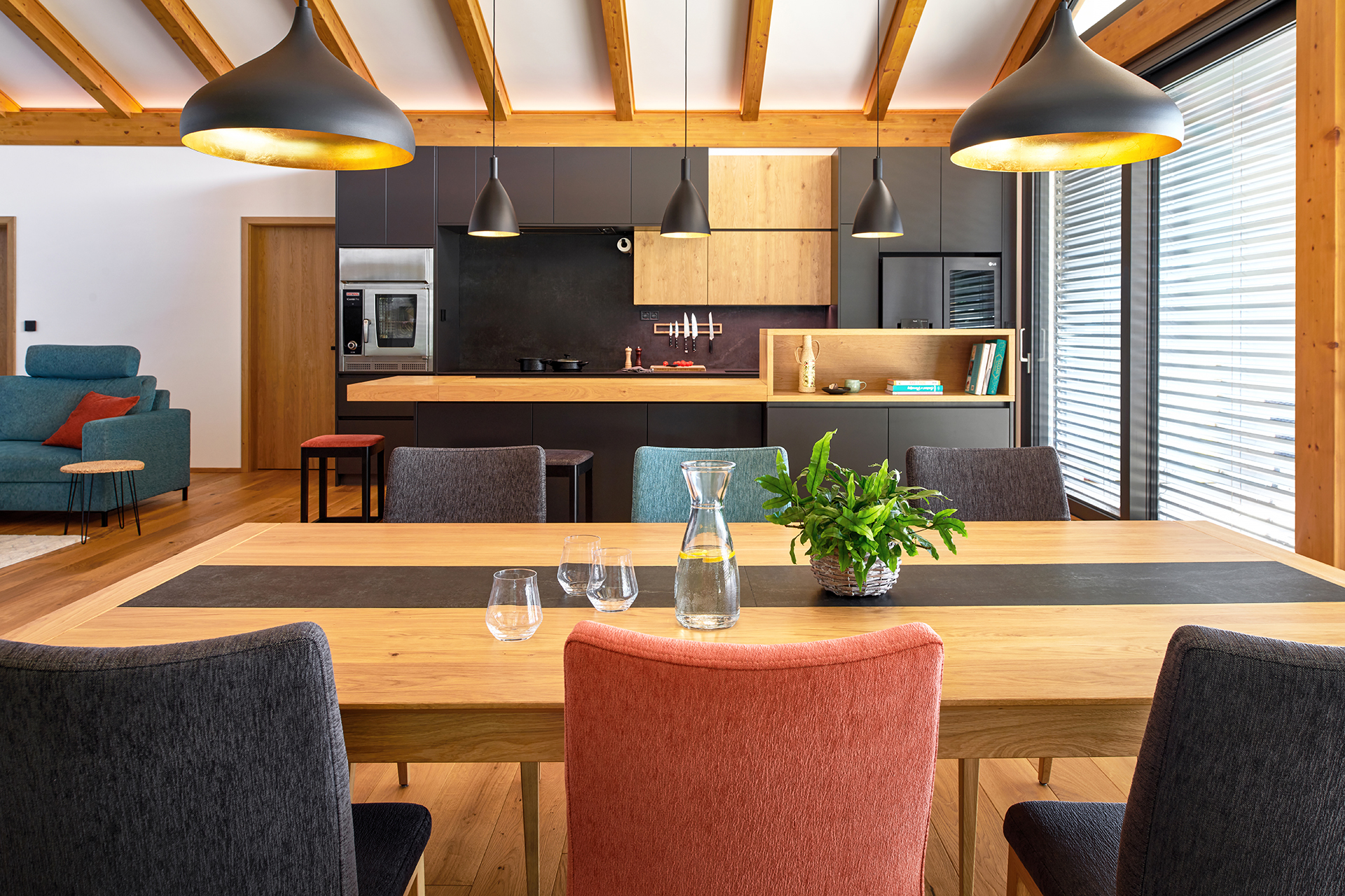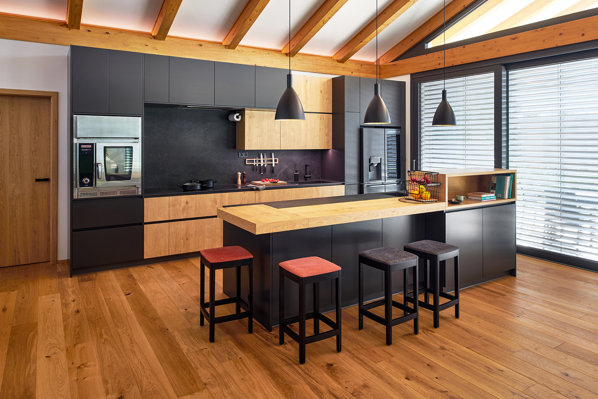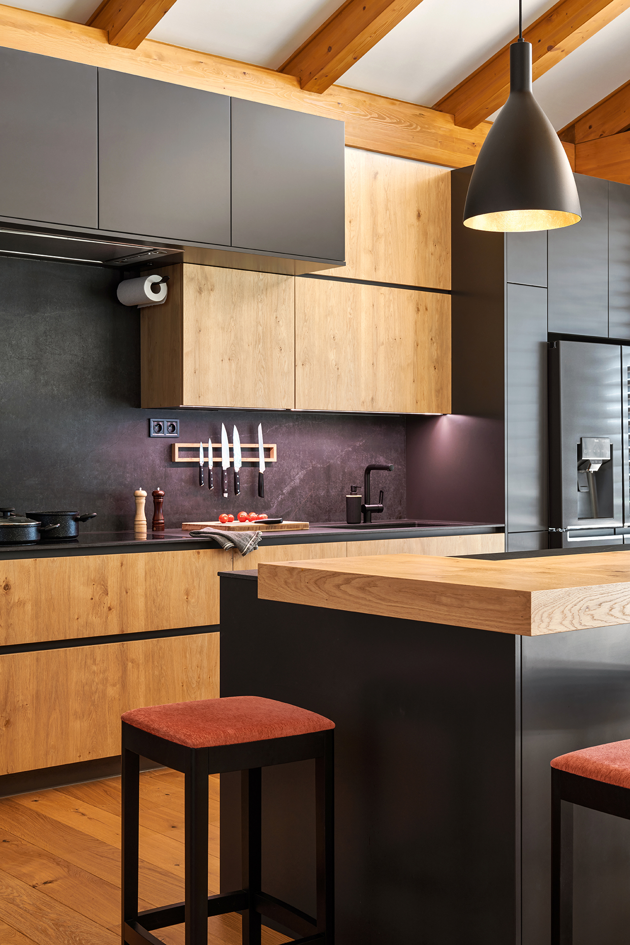 Dizajn stavia na silných kontrastoch: tmavý matný titán dodáva interiéru moderný, sofistikovaný vzhľad, zatiaľ čo teplá rustikálna dubová dyha pridáva prírodnú teplo, ktoré ladí s masívnymi trámami a drevenou podlahou.
