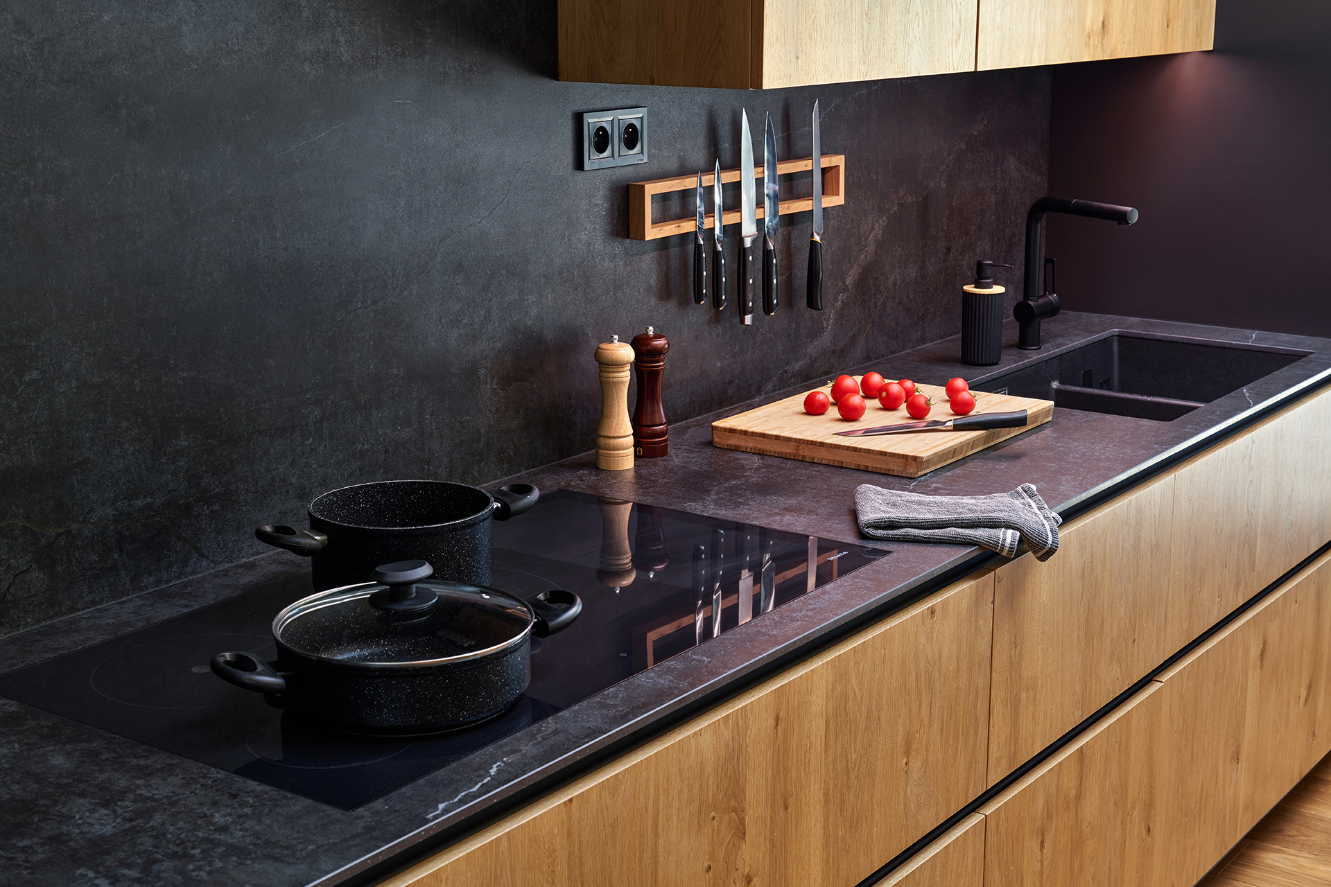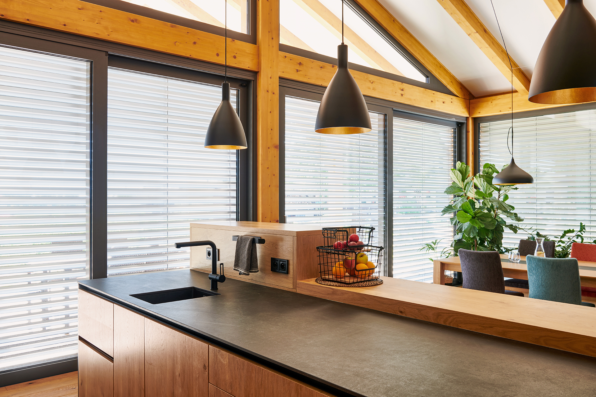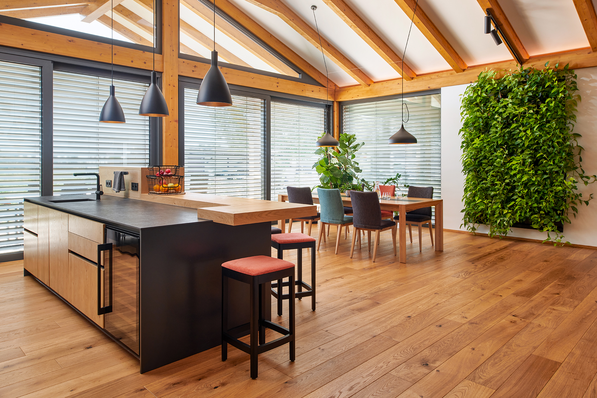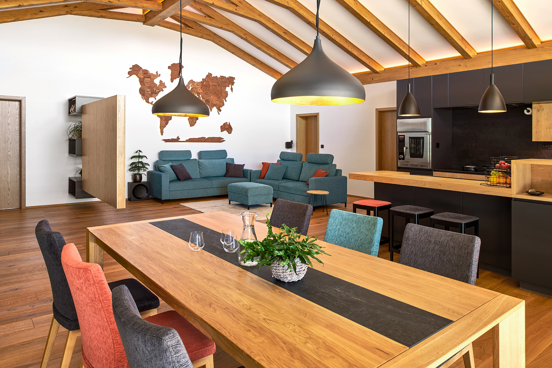 Dizajn stavia na silných kontrastoch: tmavý matný titán dodáva interiéru moderný, sofistikovaný vzhľad, zatiaľ čo teplá rustikálna dubová dyha pridáva prírodnú teplo, ktoré ladí s masívnymi trámami a drevenou podlahou.